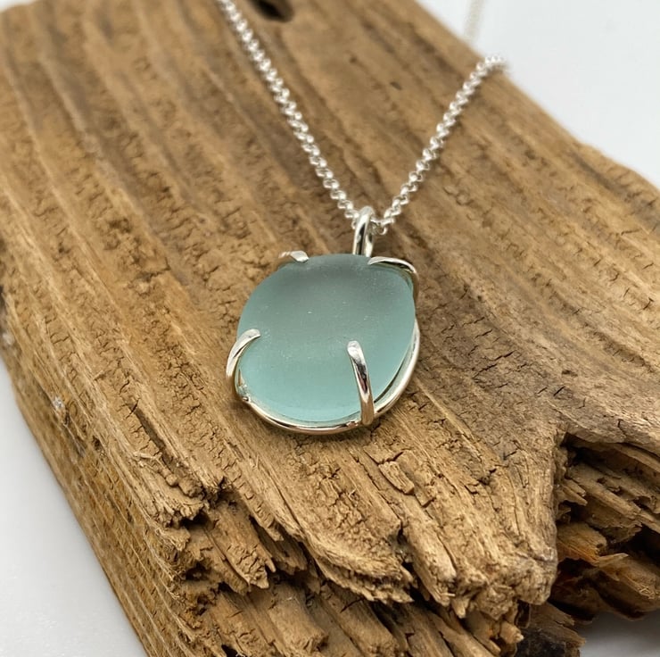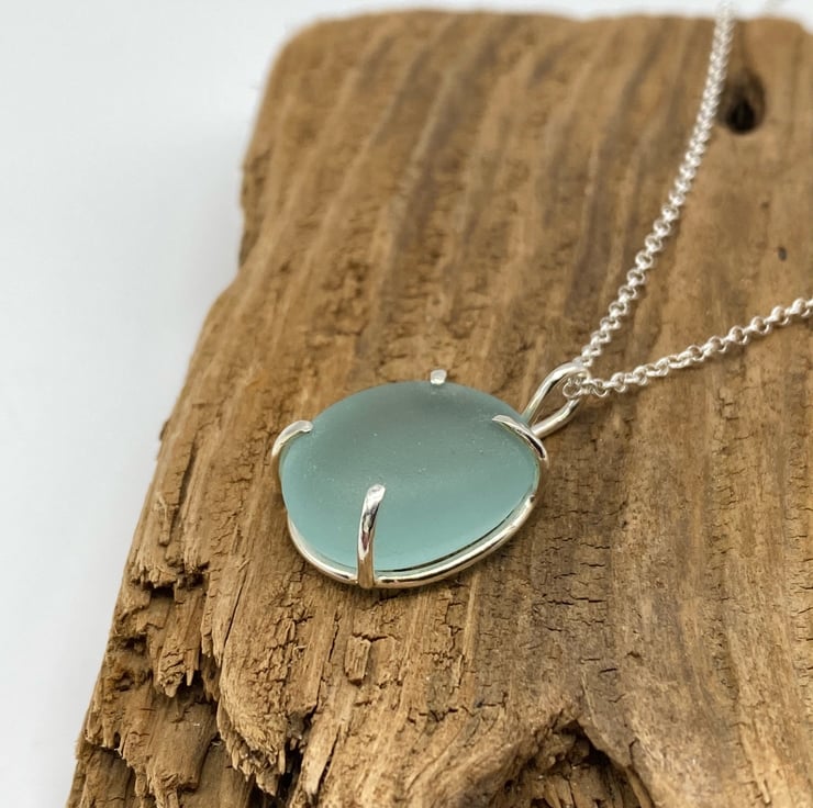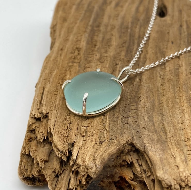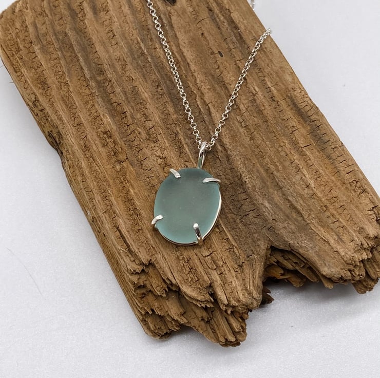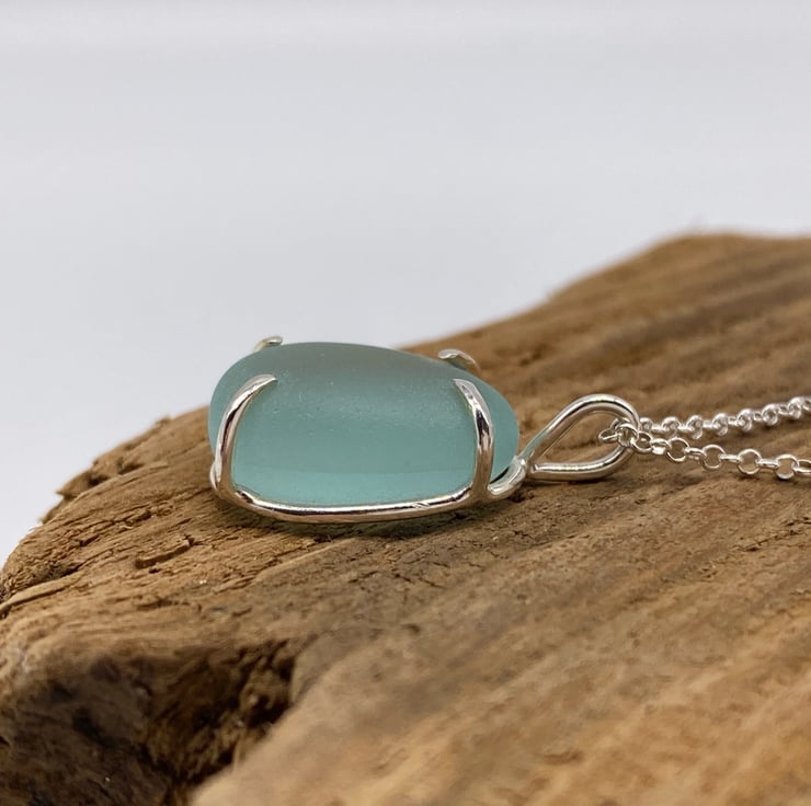I have set the sea glass in an open claw setting. This simple setting really shows the sea glass off.