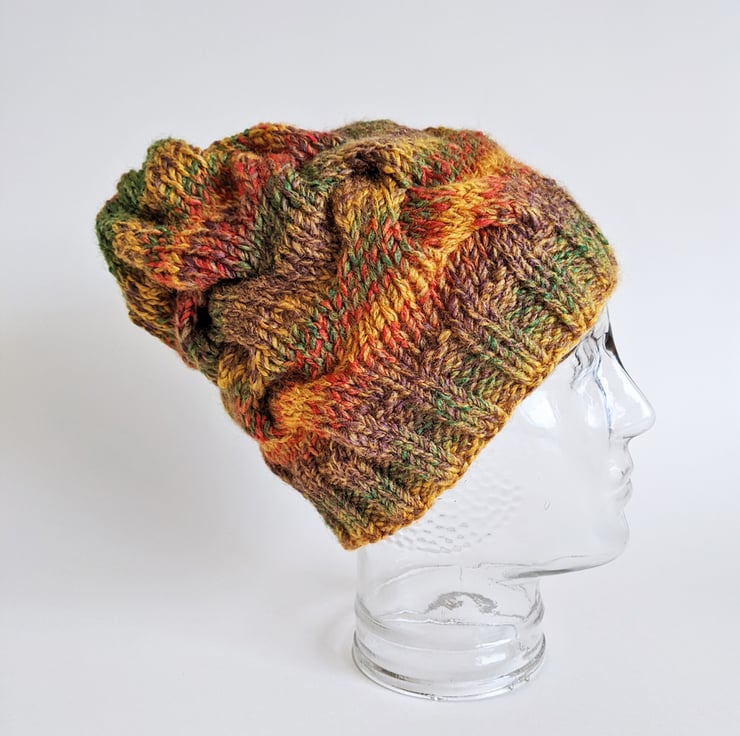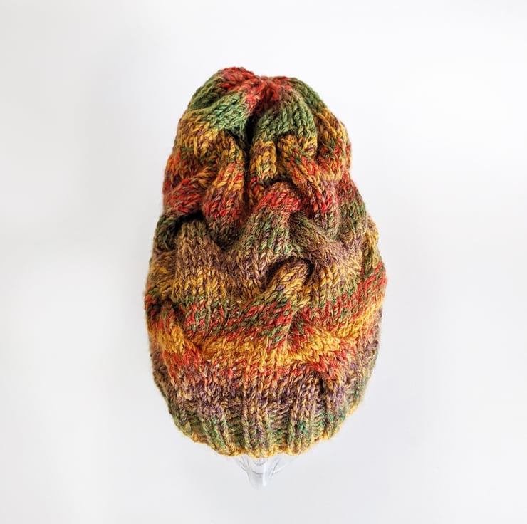 Hand knitted in a gorgeous variegated yarn in Reds, Golds, Greens and Browns, this soft and warm hat has a lovely cable design giving it a squishy feel and would make a great gift or stocking filler.