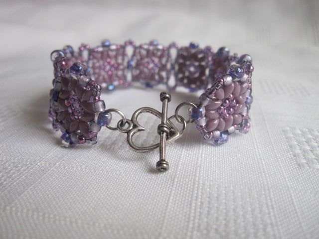 This beadwork bracelet is made using Japanese and Czech glass seed beads and mini duo beads. It measures approximately 7 inches from end to end including the clasp and approximately 6 inches across the 9 squares. There is an antique silver heart shaped toggle clasp. This bracelet will come in an organza bag. Gift boxed options available at checkout.