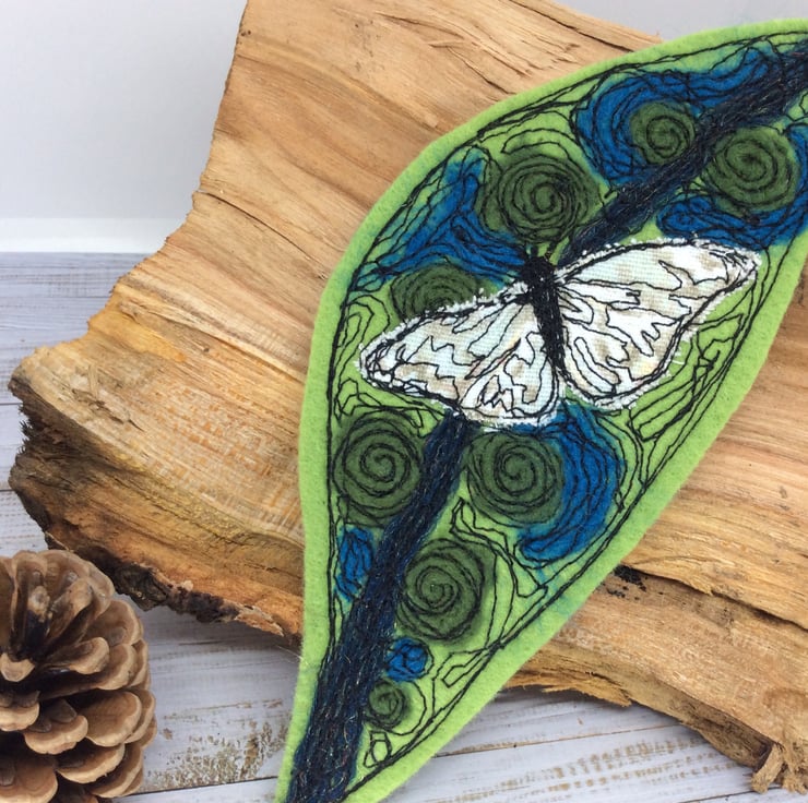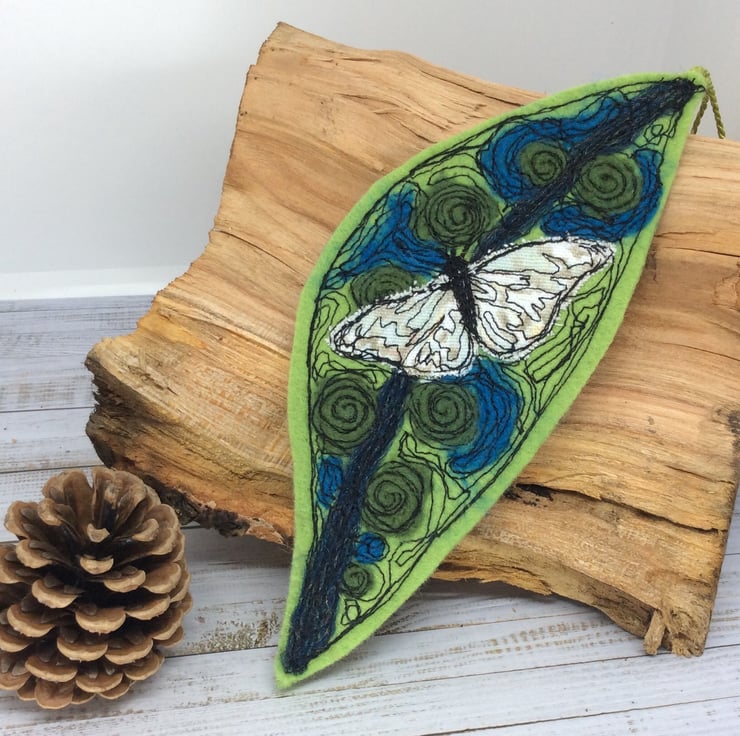 This handmade original needle felted decoration has been enhanced with a butterfly, coloured wools and free motion embroidery. It’s felt backed with matching cord. It measures 19cm x 7.5cm approx. With the ribbon the length is 27cm.