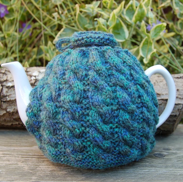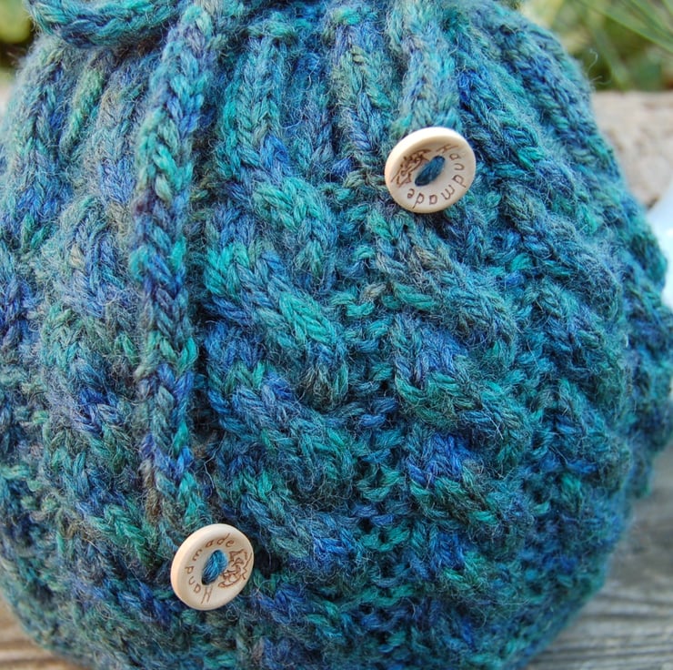 Hand knitted tea cosy with a cable design in a gorgeous blue and green toned yarn. Draw string top with wood buttons on ends stamped 'hand made'.