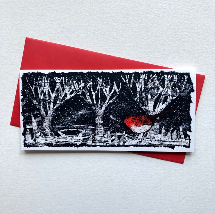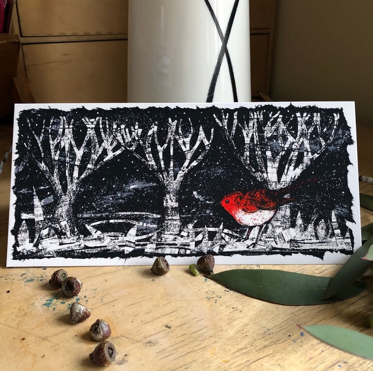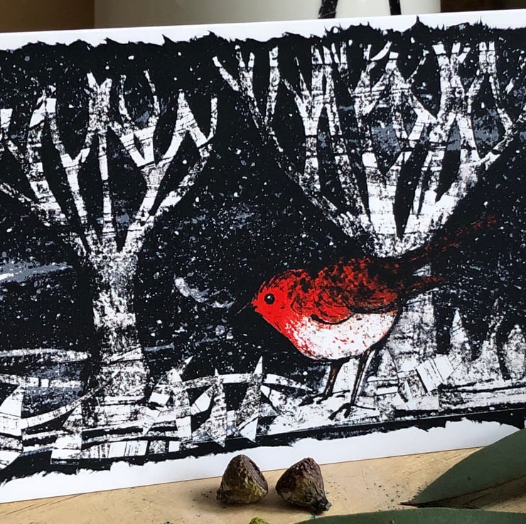 This card features our native Red Robin foraging in the ground beneath the trees in a winter woodland covered in snow.