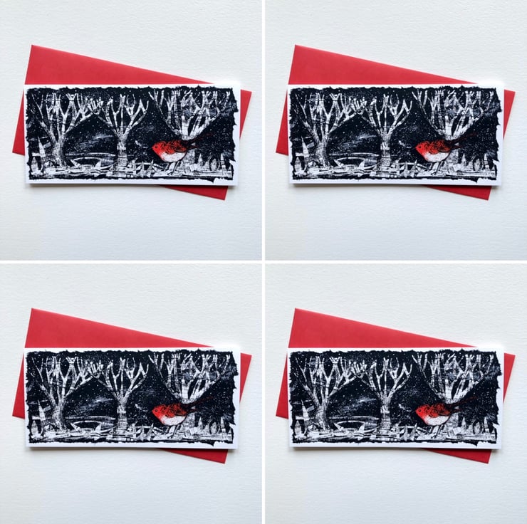 Each card is identical and measures 99mm x 210mm, left blank inside for your own Christmas message. Pack includes four rectangular, deep red envelopes and will be wrapped in a compostable cellophane bag for protection during posting.