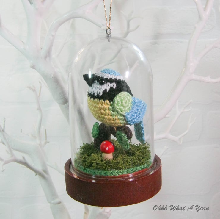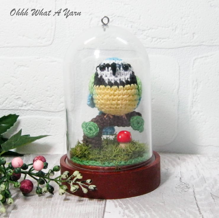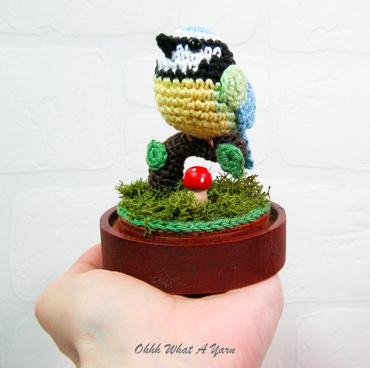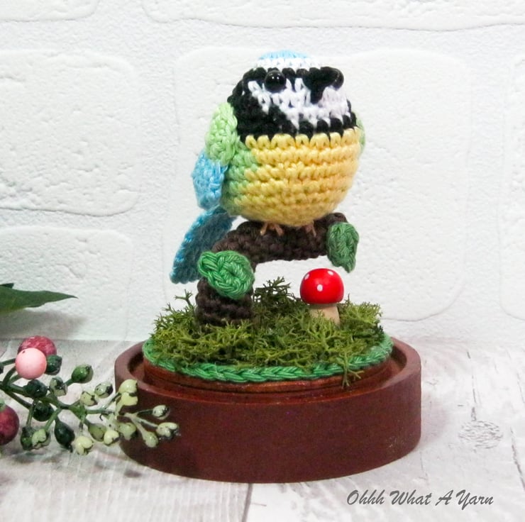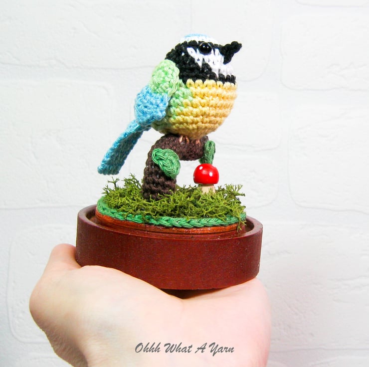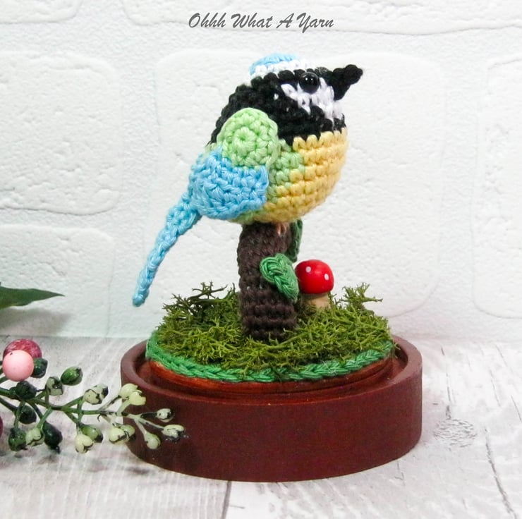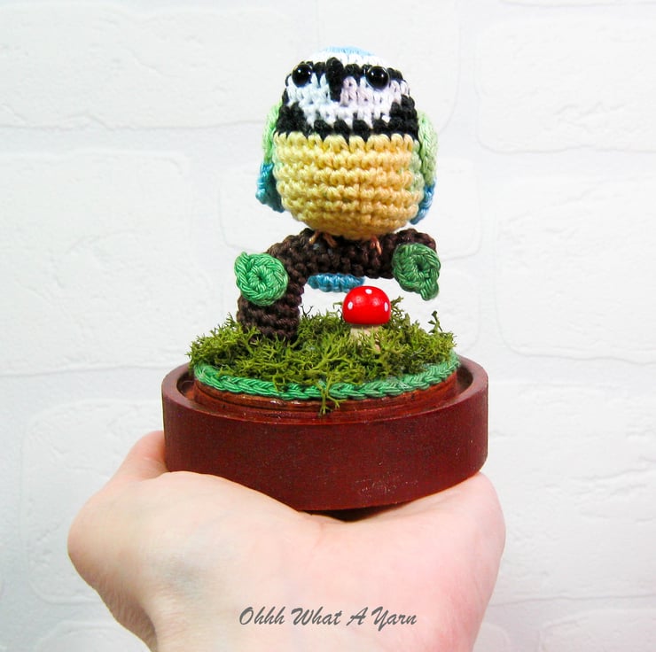 This cute little crochet bluetit is sat on a crochet tree branch decorated with crochet leaves.