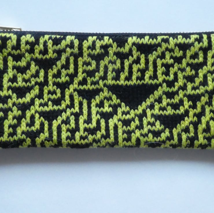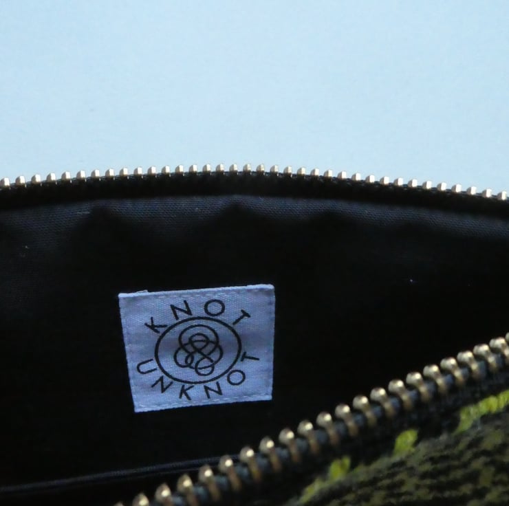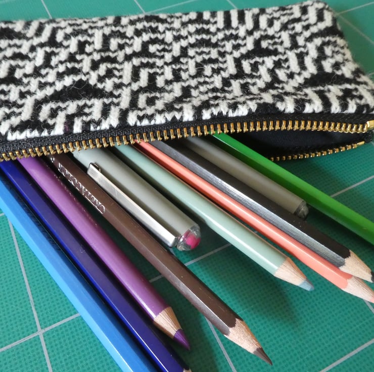 A flat version of the standard Rule 30 pencil case in yellow and black. It has the same has a sturdy zip and lining and is still ideal for carrying writing and drawing tools, or knitting and sewing essentials. (Contents not supplied, obviously!) The outer fabric is pure Shetland-style wool from one of Scotland's oldest mills.The lining is polyester cotton and the zip is black with gold coloured metal. The dimesions of the case are approximately 8cm by 20.5cm.
