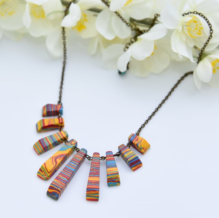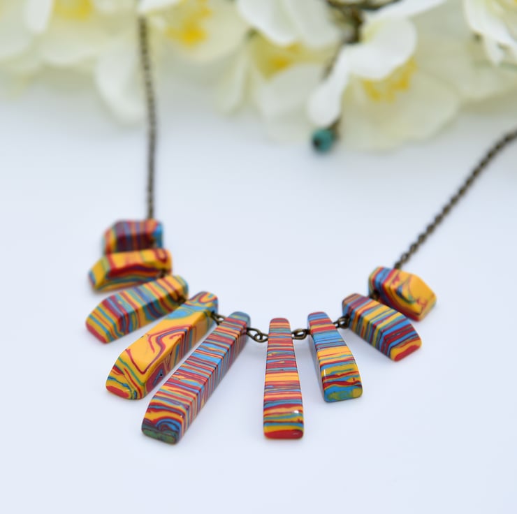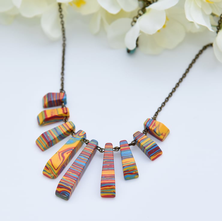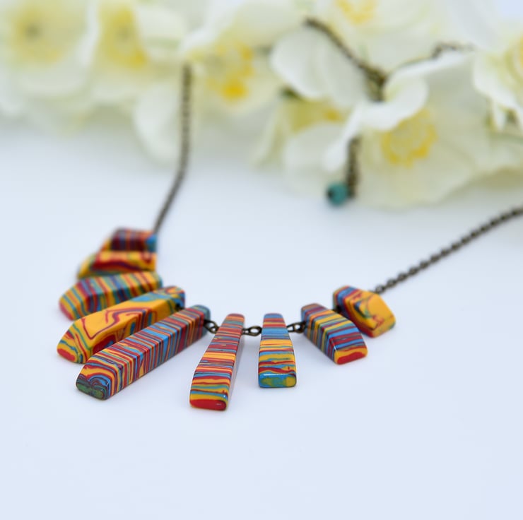 A statement, bib necklace featuring a fan of red, yellow & blue Howlite beads and antique bronze findings.