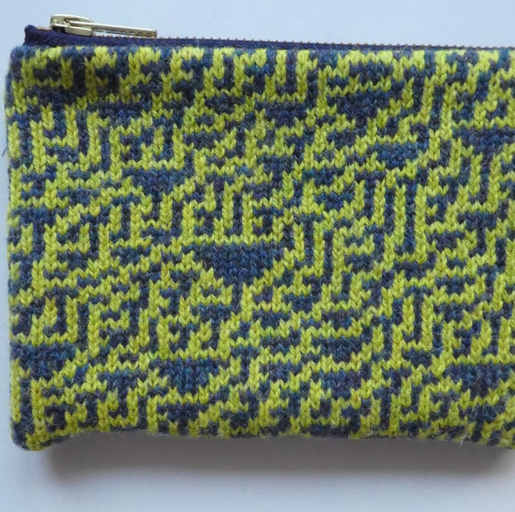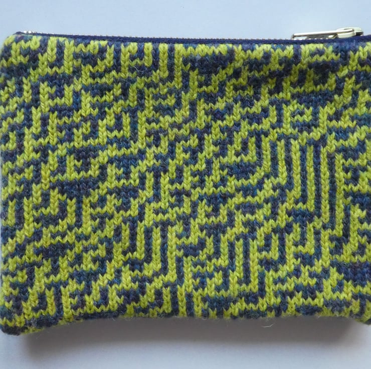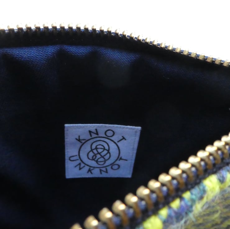 A handy purse in the Knot Unknot signature Rule 30 knitted fabric. It has a sturdy zip and lining and is ideal for carrying cash, bank cards,small tools or knitting and sewing essentials. The outer fabric is pure Shetland-style wool from one of Scotland's oldest mills.The lining is navy blue polyester cotton and the zip is navy blue with gold coloured metal. The dimesions are approximately 11cm by 15cm.
