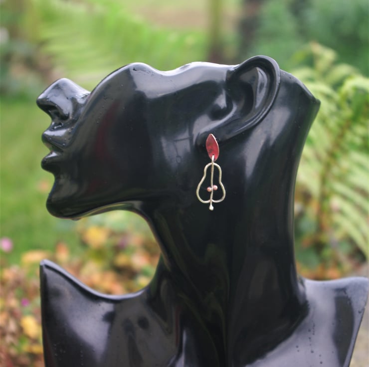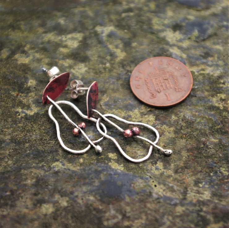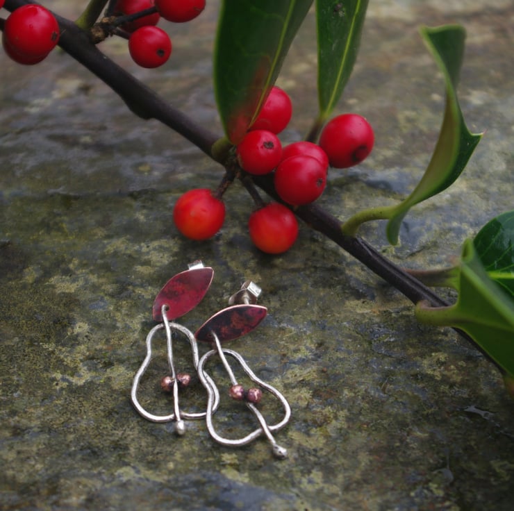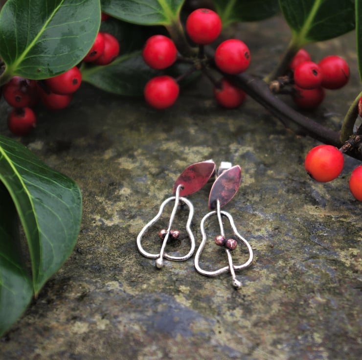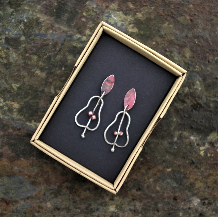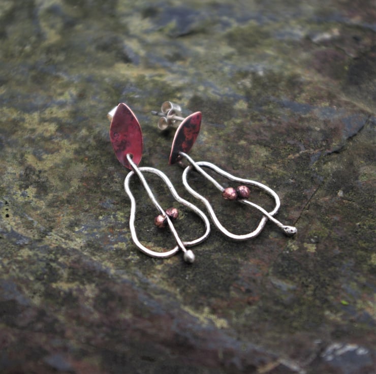 Silver wire pears with copper leaves and a stud fastening. The silver earpost is attached to the leaf, so that the pear shape hangs below the earlobe . The pear moves about freely as it is attached to the leaf with a loop of silver wire , which goes through the leaf and forms the stork running through.. It is soldered closed, so that it is permanently attached.