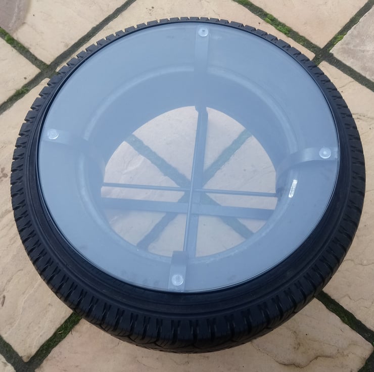 This original design coffee table has been handmade from a reclaimed tyre, steel frame and toughened glass table top.
