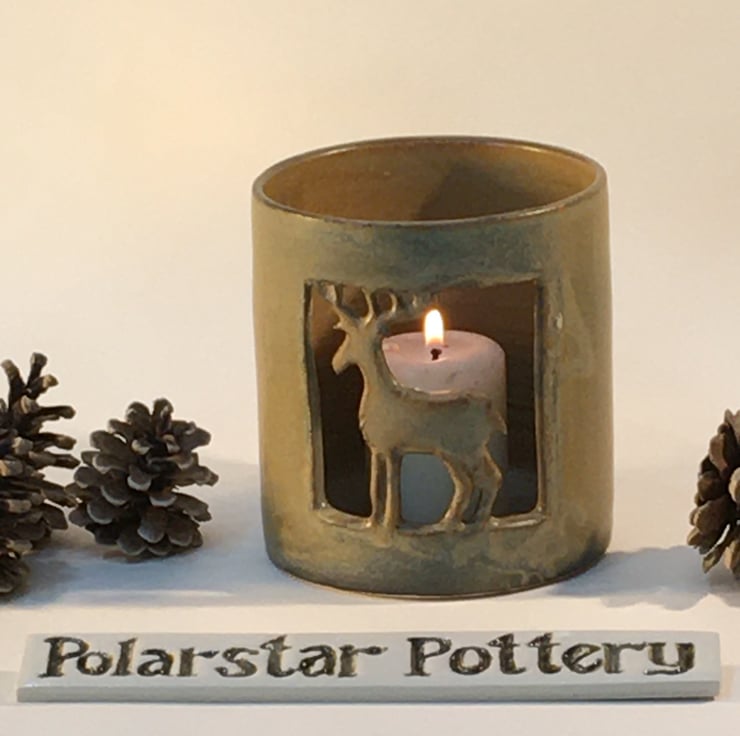 Handmade ceramic candleholder with a cut-out reindeer design.