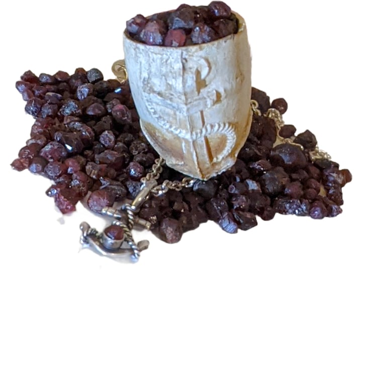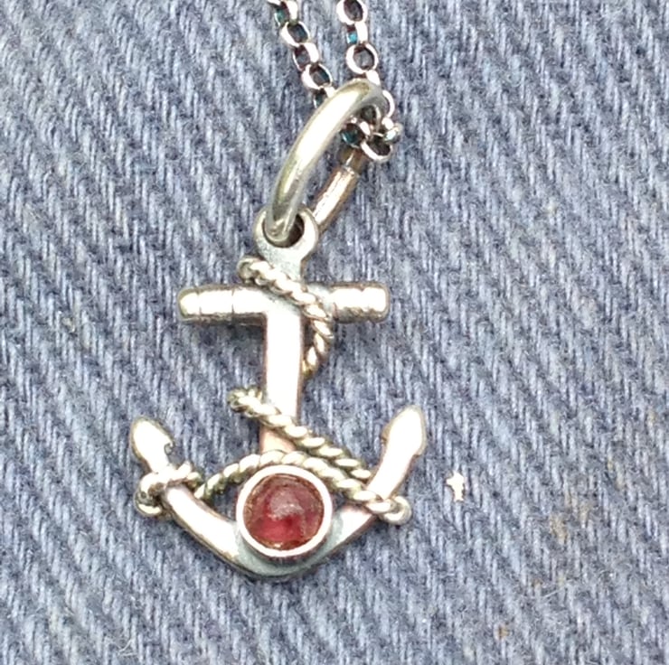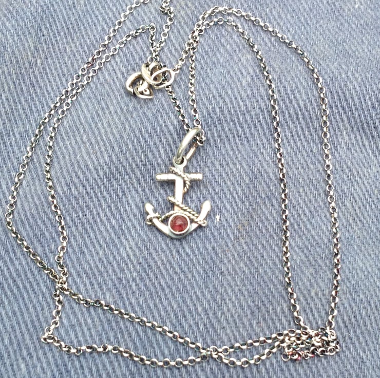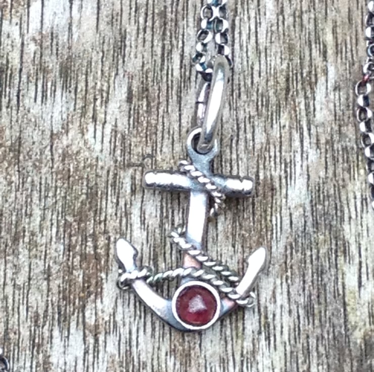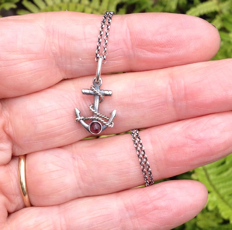 Sterling silver anchor pendant with a Thames garnet. Oxidised to enhance the details. Comes with an 18 inch sterling silver Belcher chain.