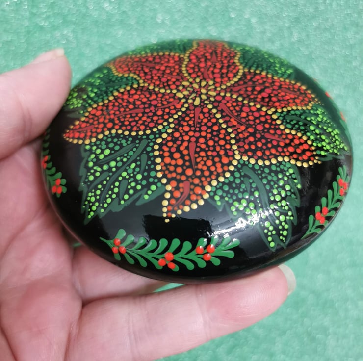 Beautiful hand painted dotted Poinsettia decorative stone which has a diameter of approx 3 3/4 inches and weighs approx 140g.