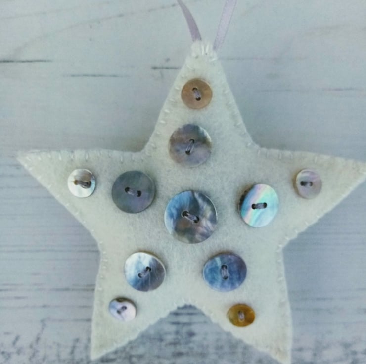 Christmas star decoration made in a soft felt and decorated with mother of pearl buttons with grey and cream tones, edged with blanket stitch and trimmed with a ribbon for hanging on your tree. Completely hand stitched. Free delivery on this item.