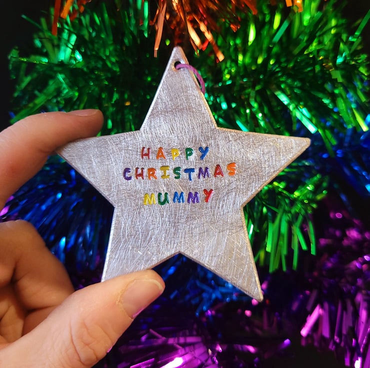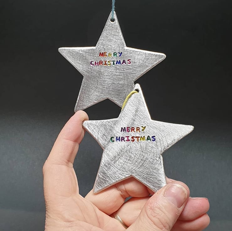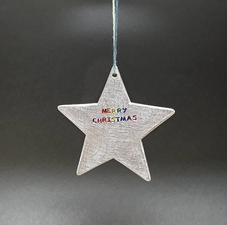 A shimmering star hand pierced from pewter sheet, stamped with Merry Christmas and the letters brightly coloured with a rainbow!