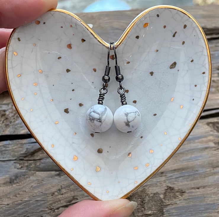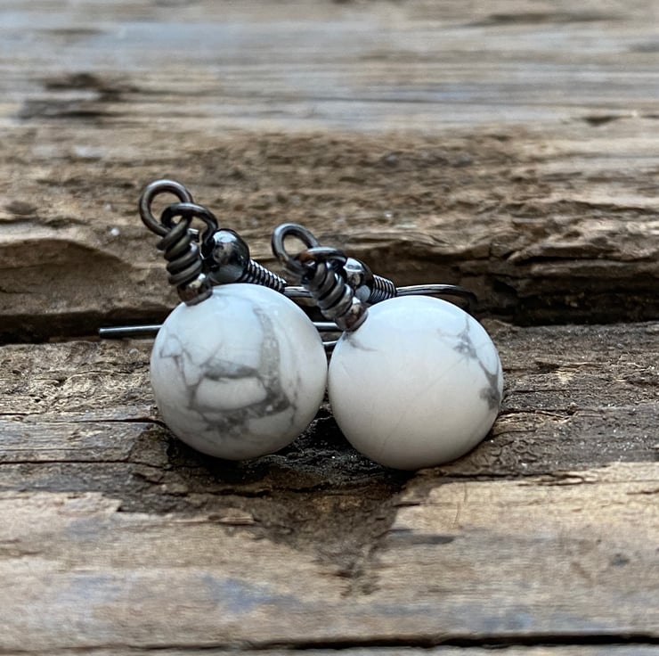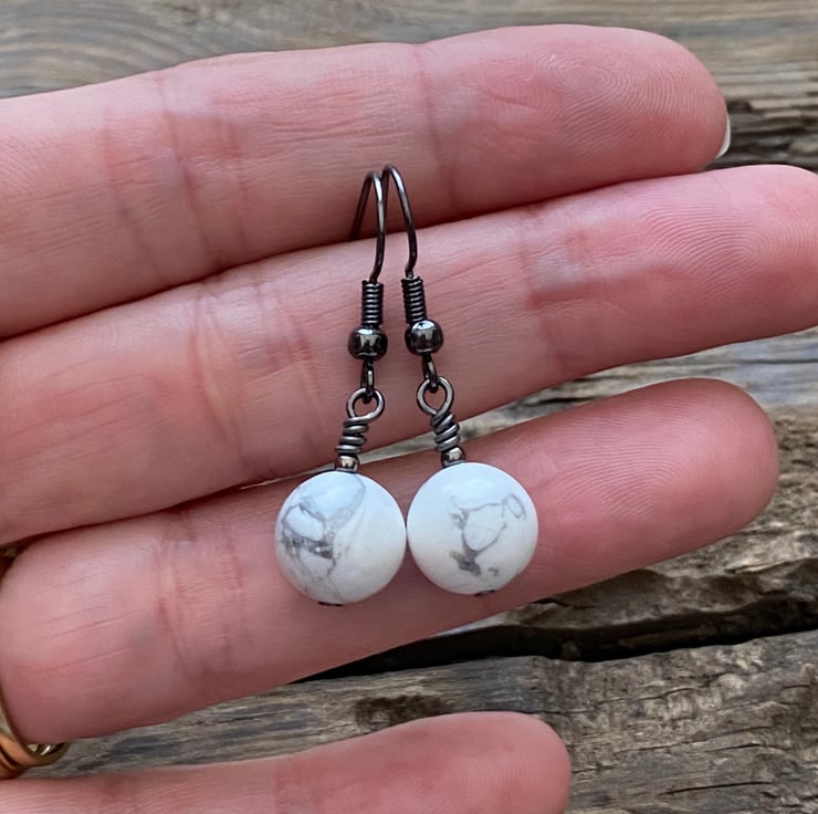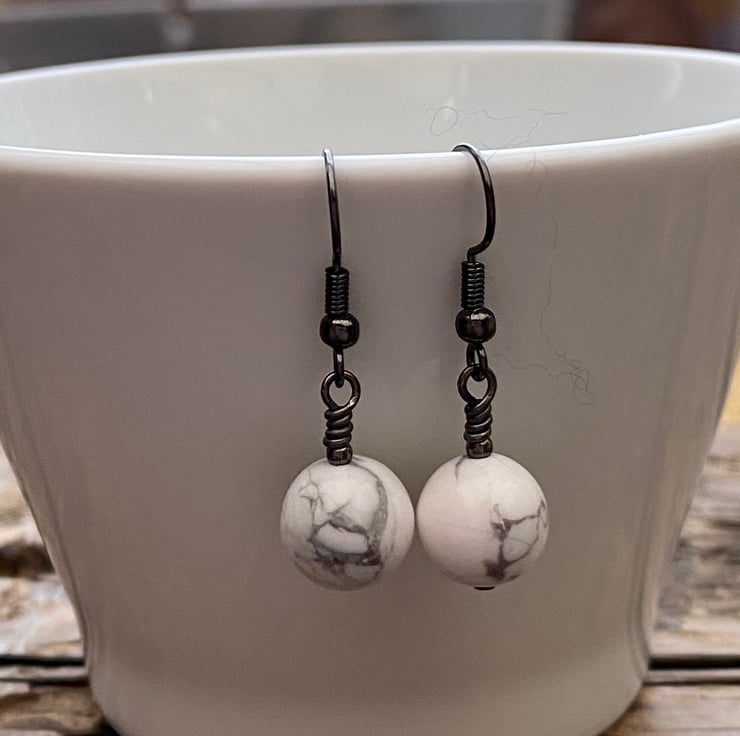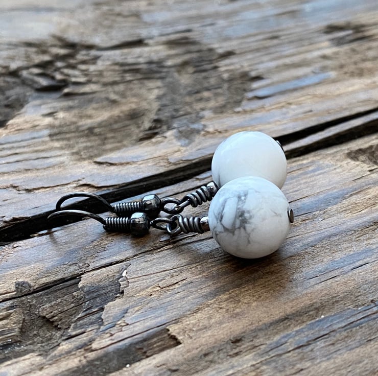 10mm White Howlite beads hand wired onto antique black brass headpins and hung from matching earrings.