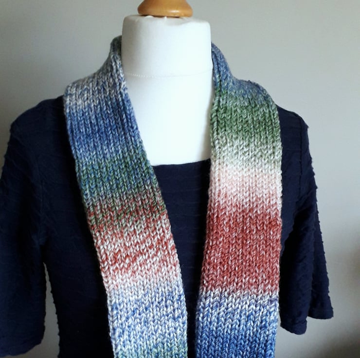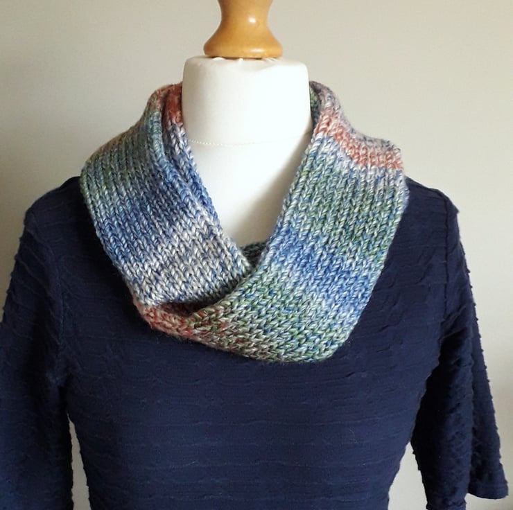 This infinity scarf has been knitted from beautifully soft acrylic yarn in wonderful shades of blue, green and bronze, which blend to create a marbled effect. It is double thickness and long enough to wear in a variety of ways, so will keep you really warm.