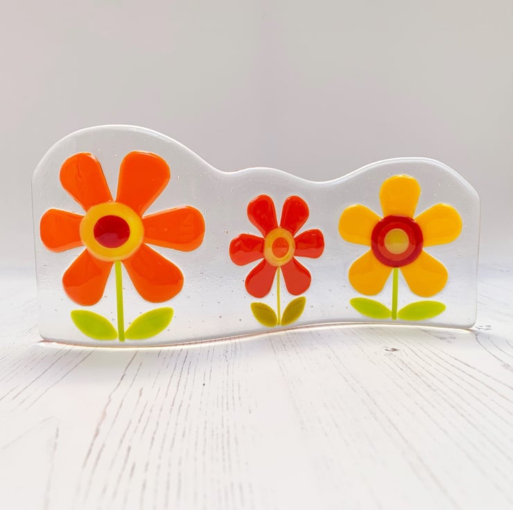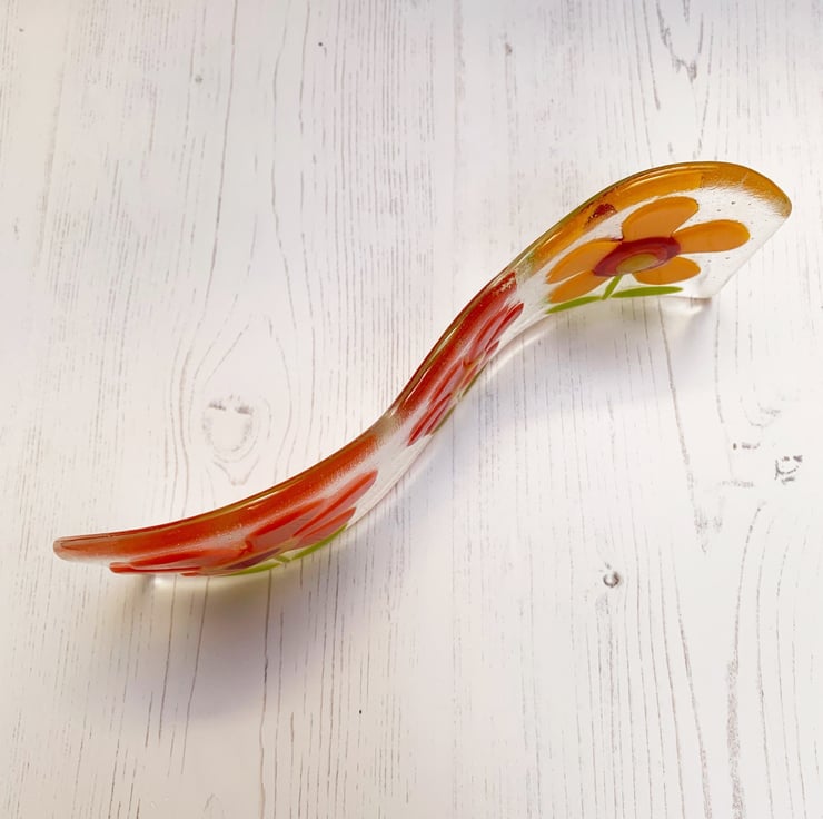 To make this piece I hand cut transparent art glass and then slowly fuse it in my kiln overnight to form a solid clear base. I then hand cut and shape art glass in tones of yellow, red, orange and green and arrange onto the pre-fired background. This all goes back into the kiln for a second slow overnight firing at a lower temperature to tack fuse the flowers onto the transparent background, this lower temperature means the flowers, stem and petals stand slightly proud of the glass, to give it a slightly 3D effect. When completely cooled, I then put the piece into the kiln a third time to slowly slump it over a ceramic mould, giving it it's freestanding wave shape.