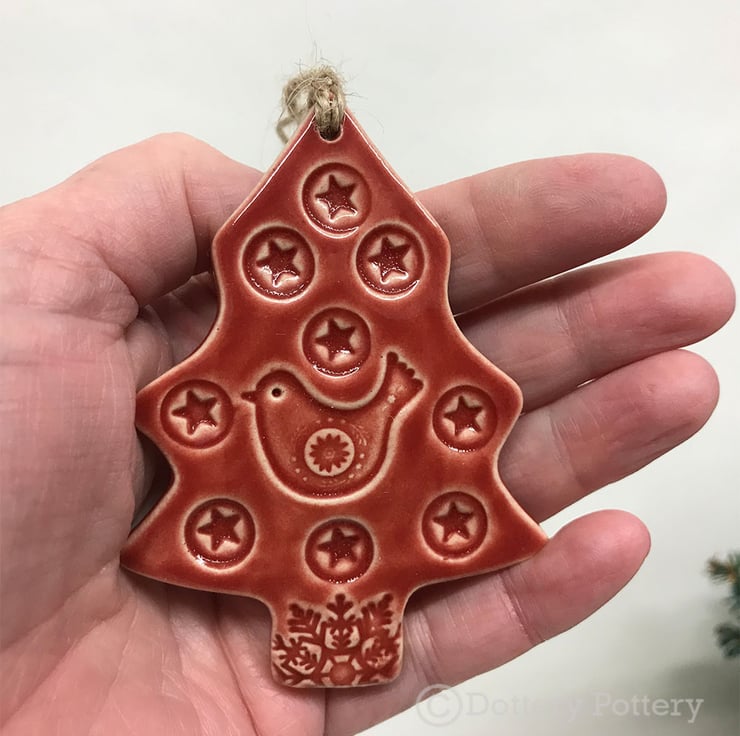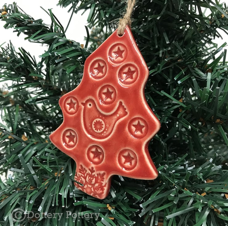 This highly decorative Christmas tree is made from white earthenware clay. It has been imprinted with a gorgeous bird and star pattern. It has been fired twice and finished with a rich, glossy glaze. The back is plain and unglazed. It measures 8cm x 6cm and hangs from a brown string