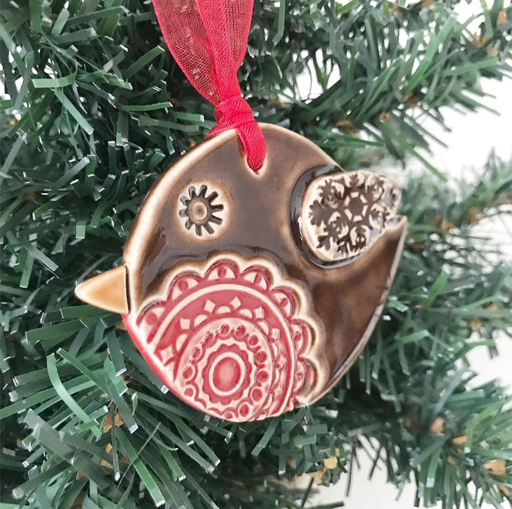 This cute little robin is made from white earthenware clay and decorated with pattern. It has been fired twice and finished with rich, glossy glazes. Glazed on the front only. It measures 8cm x 6cm x 0.7cm deep and hangs from a matching organza ribbon.
