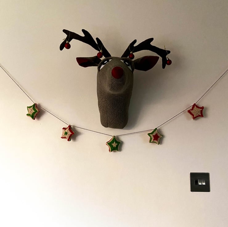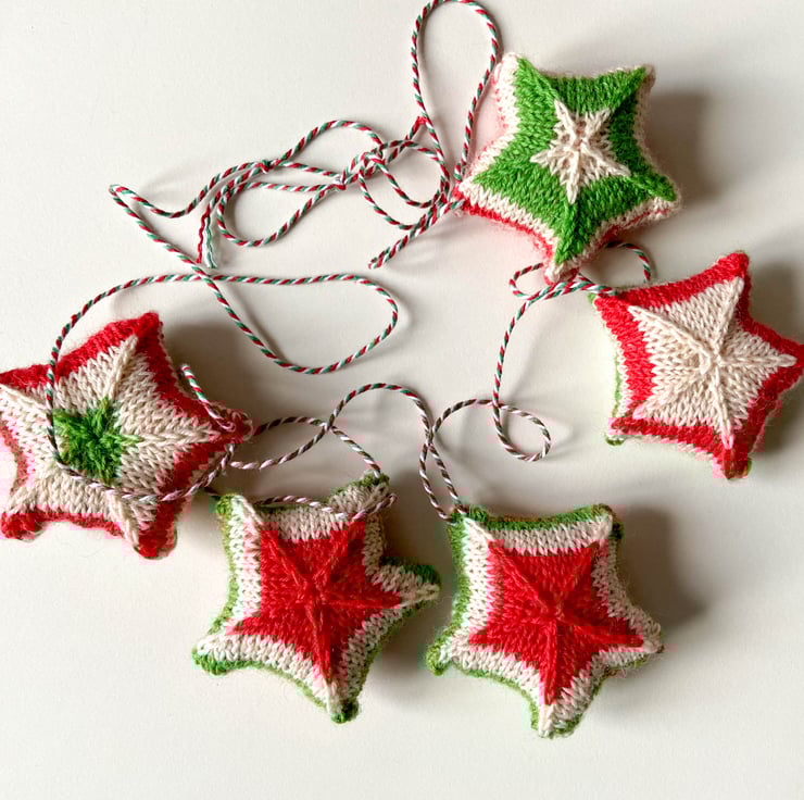 Super cute bunting made from five hand knitted stars and cotton baker's twine. Knitted using 75% wool (35% of which is Bluefaced Leicester) and 25% nylon and stuffed using toy grade wool stuffing which conforms to EN71, BS1425, BS5852, each star is slightly different in pattern but all measure approximately 7cm across.