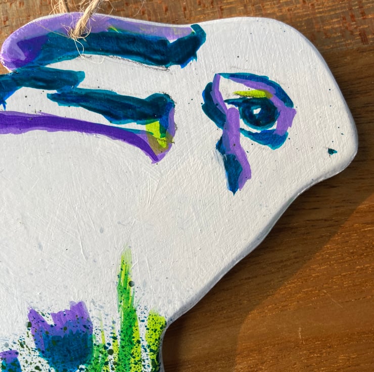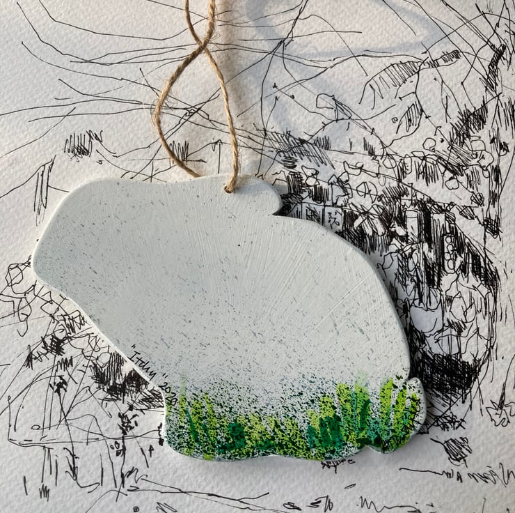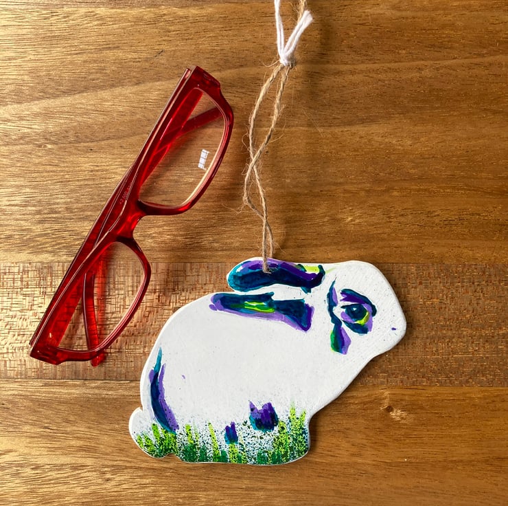 Cut out of wood by hand, painted with acrylic inks and detail added with pigment ink pen. The front of all of my Bunnies are as similar as I can get them, the backs are all painted white with grass detail, signed and the title “itchy” 2020. They are all varnished and hung with brown string.