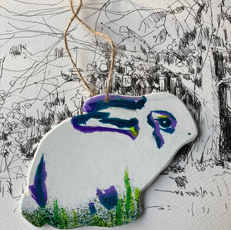 He is handmade, painted by me and was inspired by a painting I once did of our old rabbit “Itchy”. We originally found him abandoned in a lay-by with his wife “scratchy”, we took him home and he was with us for 10 years.