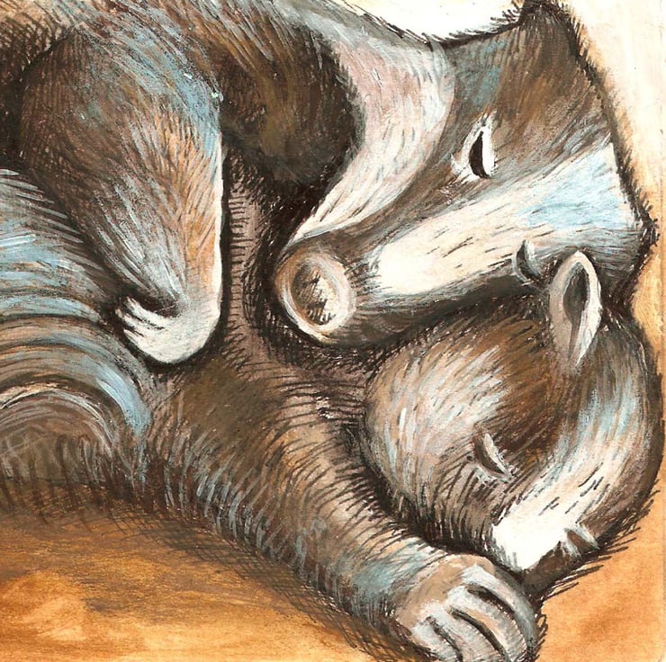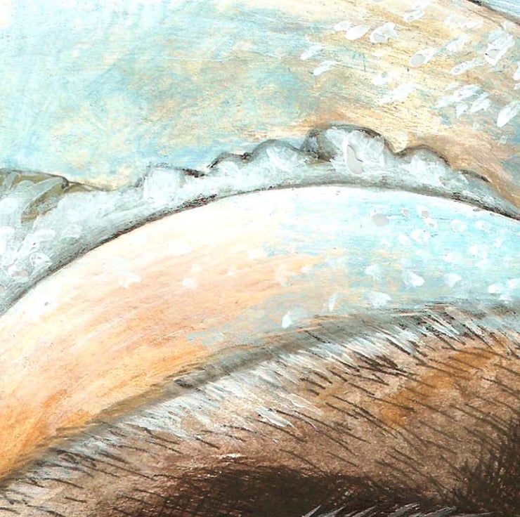 It's midwinter, and the wild animals of the field and forest are fast asleep below ground as the snow falls silently. I was inspired initially by a photograph of a dormouse hibernating in a bed of leaves. Even in the depths of winter there is life in the ground, waiting for spring.