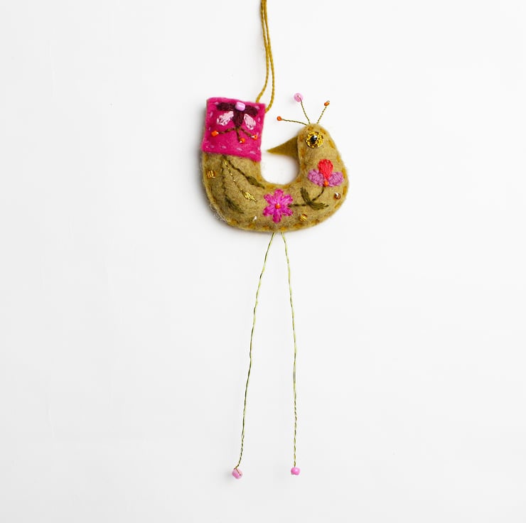 Please welcome Marzipan Basil - a bird shaped hanging decoration. Basil has been made out of colourful felt fabric and his body is hand embroidered with a folk style design. He has long wire legs and a string to hang him with. He can be used as a decoration or bag charm, he is not a toy however and should not be given to young children.