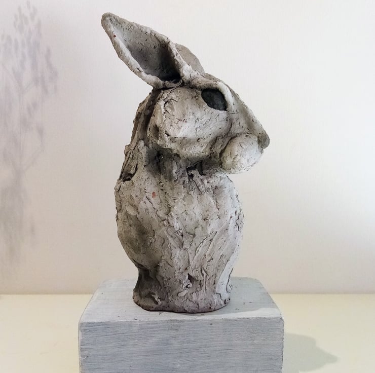Hare sketch sculpture made from a black stoneware clay and decorated with blended slips and stains.