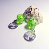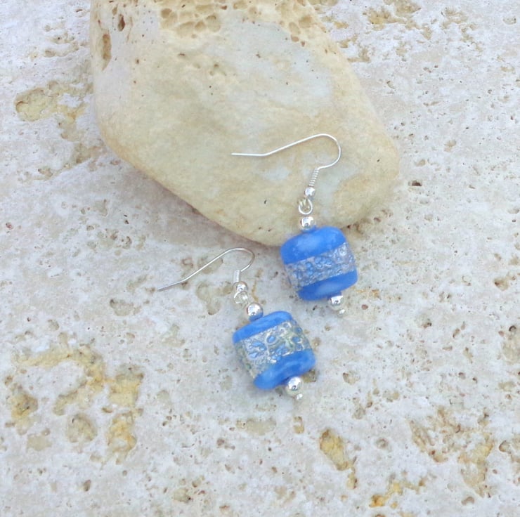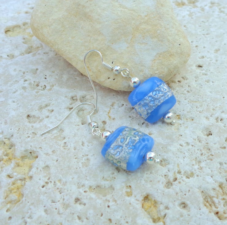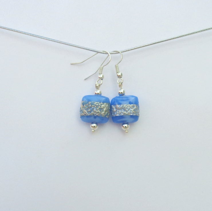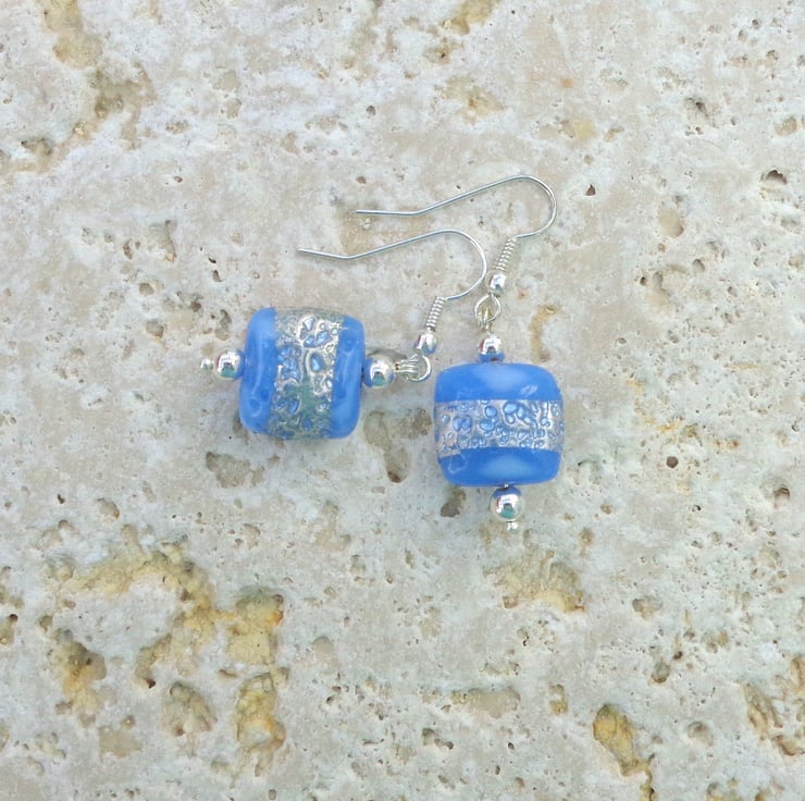 Pretty blue glass beads decorated with a textured silver band are topped and tailed by silver plated beads set on silver plated pins and hooks
