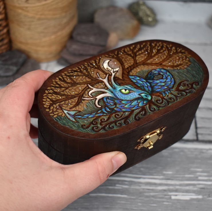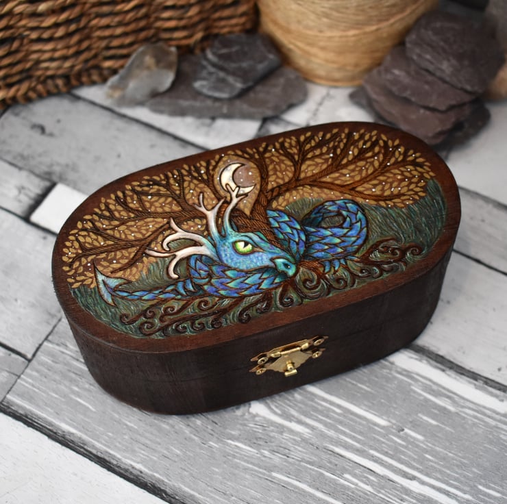 A winter dragon oval box created using pyrography. This frosty dragon is coiled round a tree, he has antlers and a blue green shimmer to his scales.