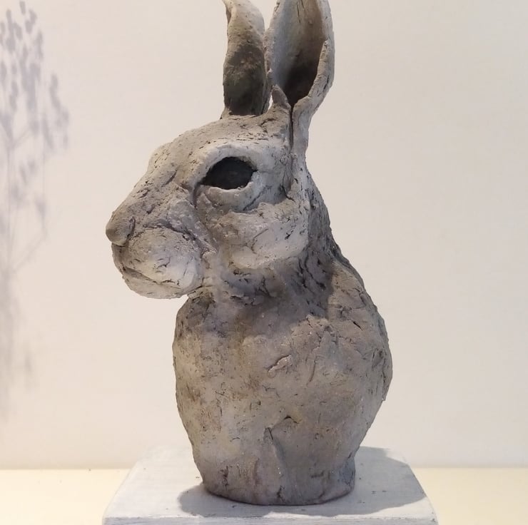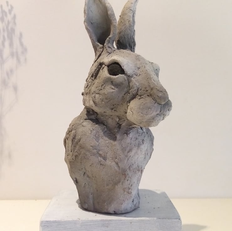 Hare sketch sculpture made from a black stoneware clay with blended slips and stains.