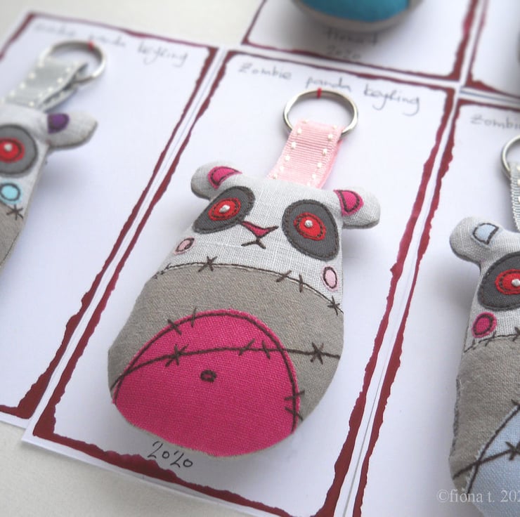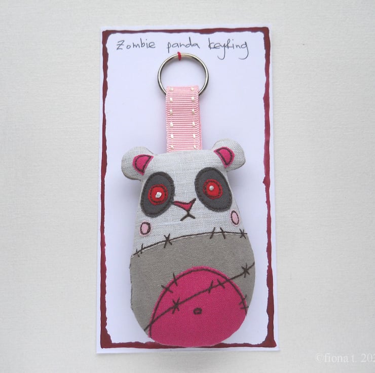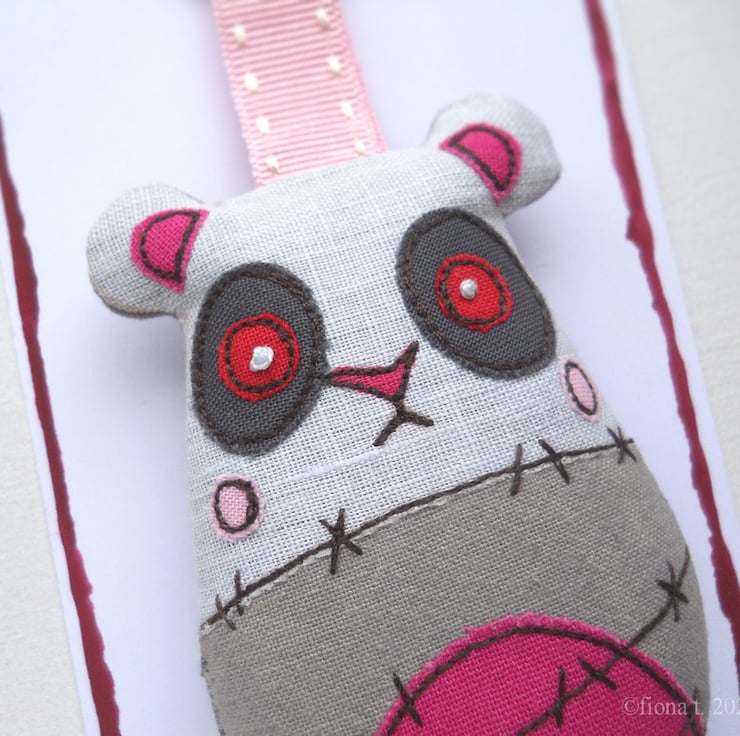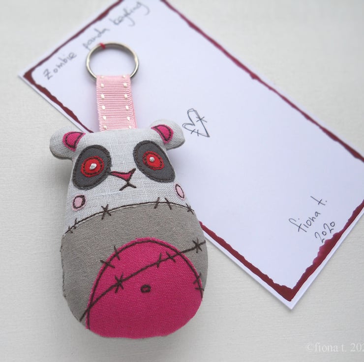 freehand embroidered zombie panda bag charm or keyring - HOT PINK.