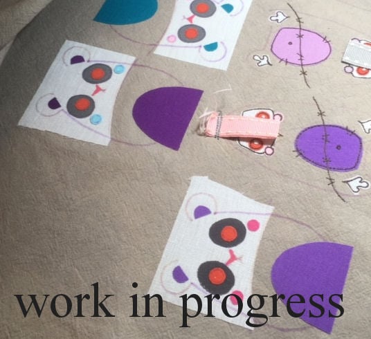 i’ve layered & appliqued pale blue irish linen & hot pink cotton fabrics onto hand dyed grey cotton calico. the intricate details are drawn freehand using free motion embroidery.