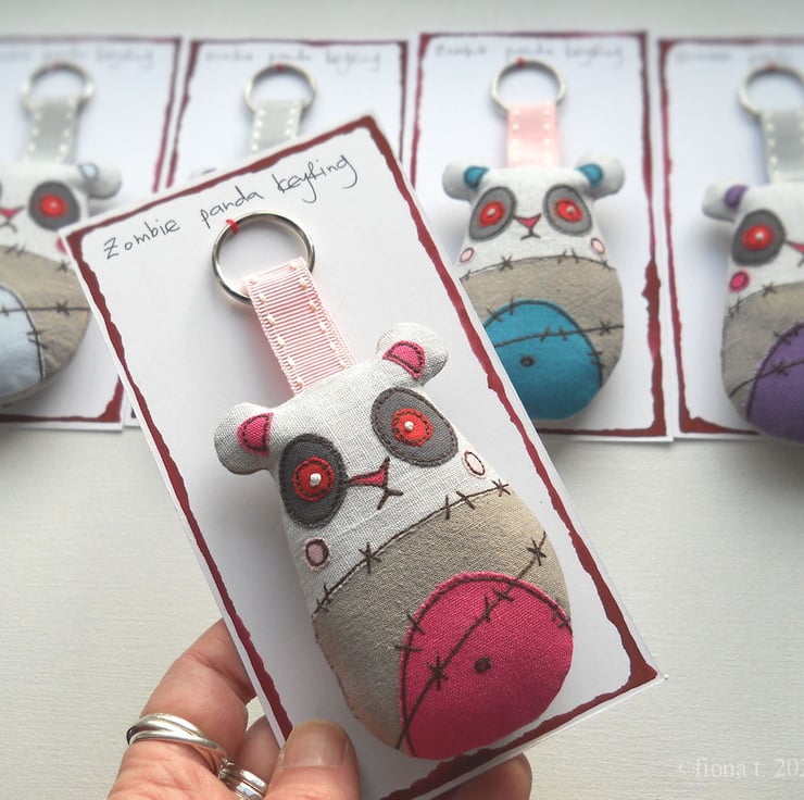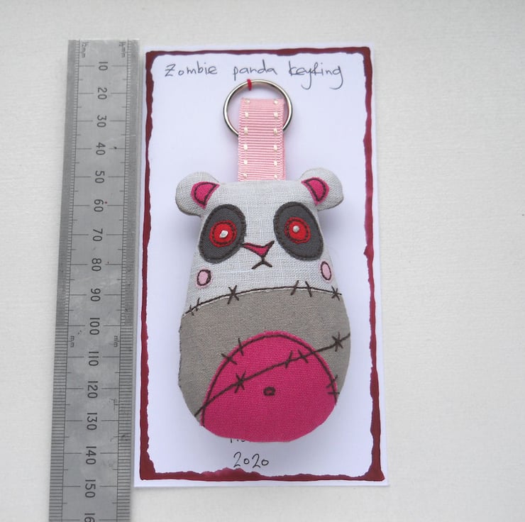 these morose little fabric zombie pandas measure about 10cm (4inches), and 13cm (5”) including hanging loop & split ring.