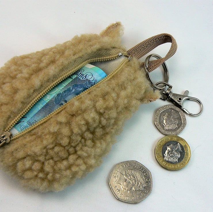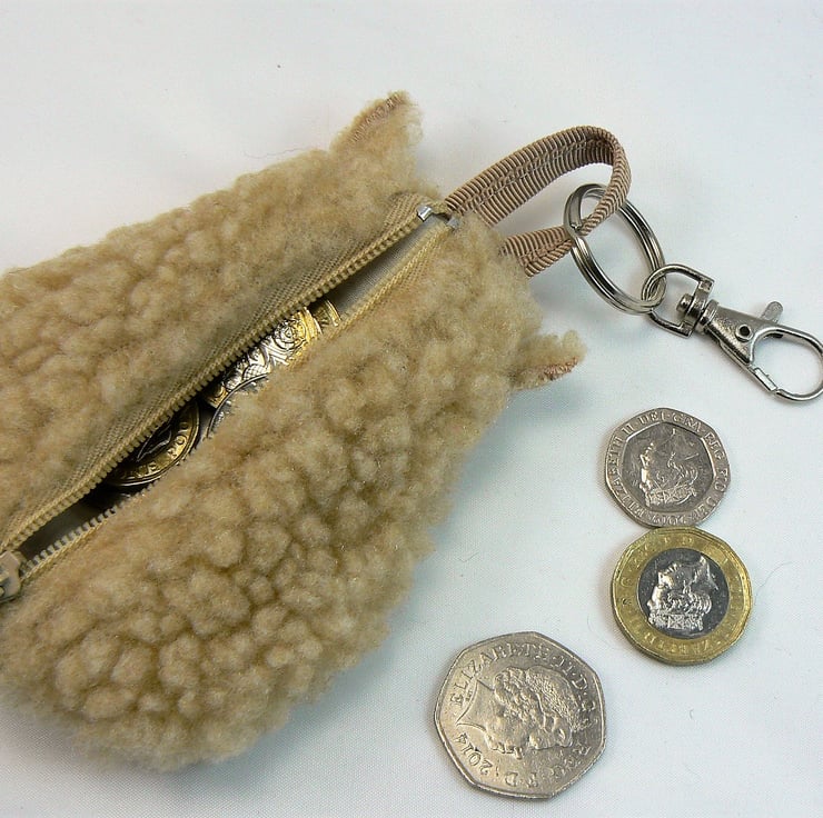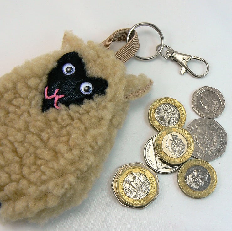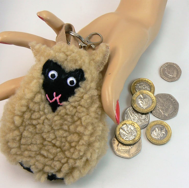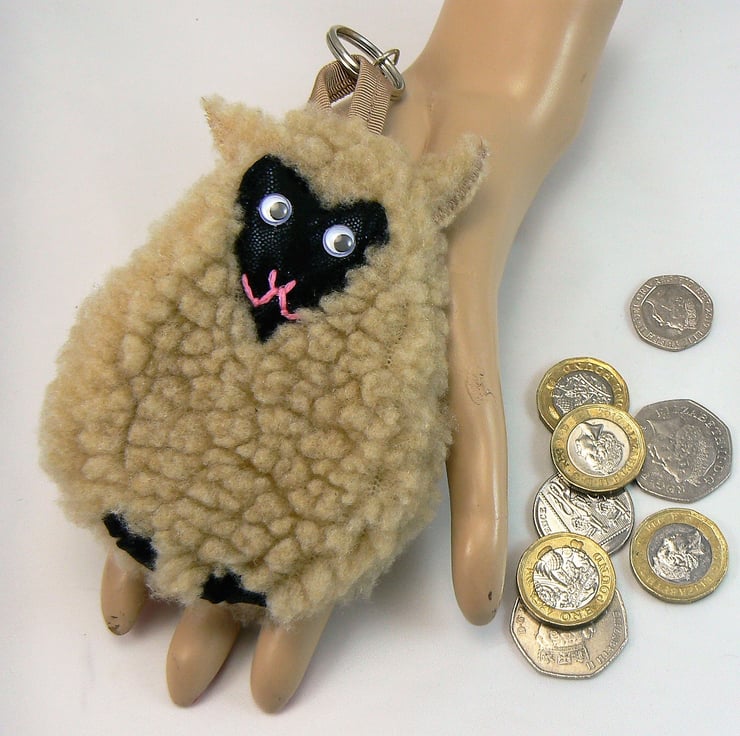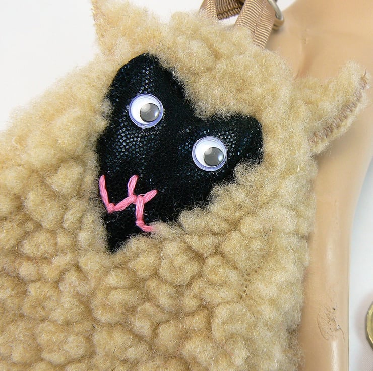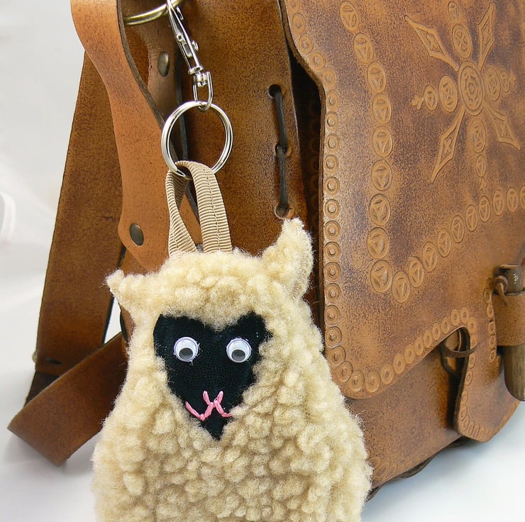 This little sheep is made from faux fur, it is lined with cotton and has a zip closure with a keyring and lobster clasp to clip on to bag if wished. She has a shiny face and hooves and googly eyes. She is four and a half inches tall ( seven and a half including hanging loop and clasp.) and three inches at the widest point.