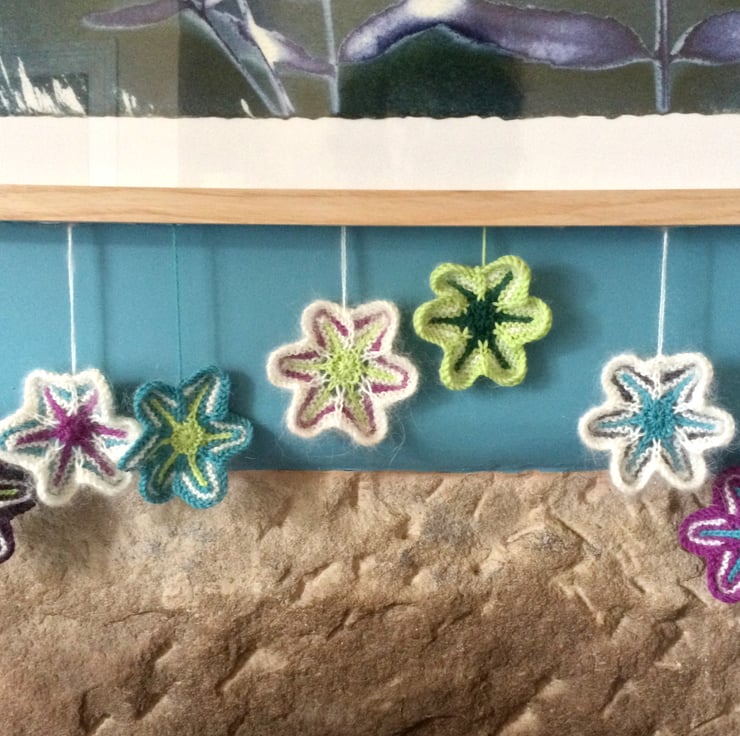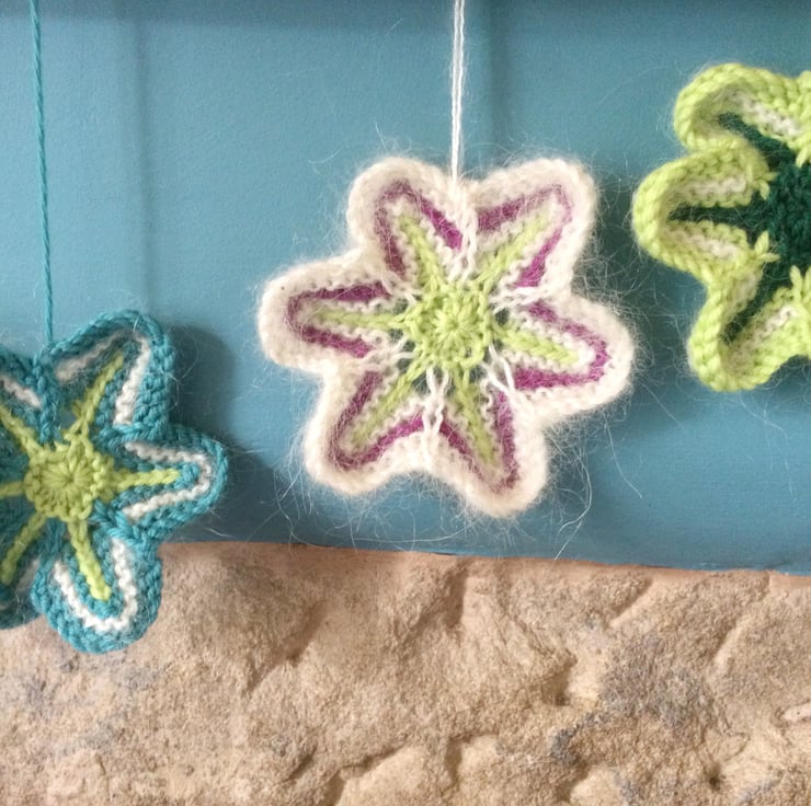 Pretty 3 coloured knitted floral star decorations worked in the round from the outside in. The star shaped design is achieved by clever stacked decreases in contrasting colours. Video tutorials to support the stacked stitches techniques found in this pattern are available.