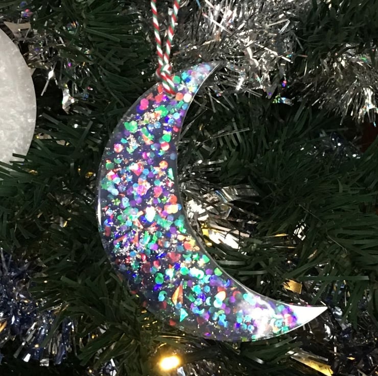 The dark sparkly moon decoration is approximately 10 cm x 7 cm (4 inches x 2 3/4 inches) in size.