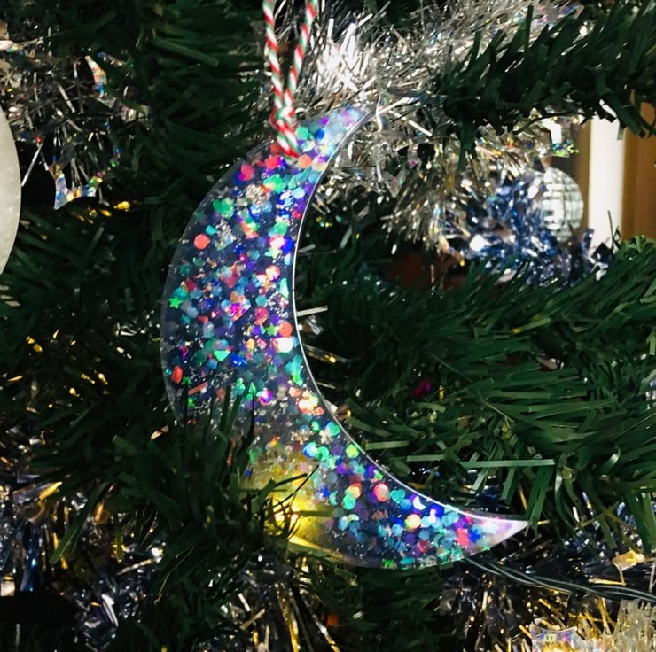 Crescent dark sparkly moon large hanging Christmas tree decoration.