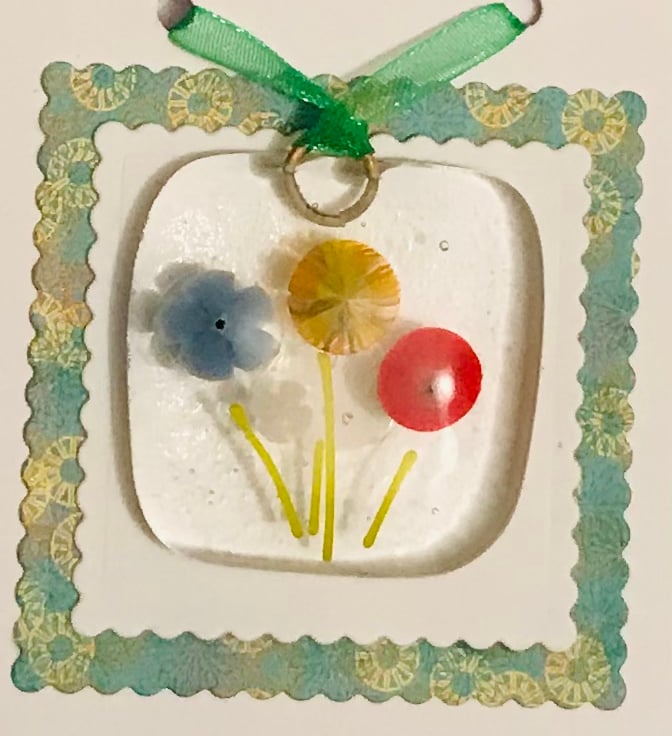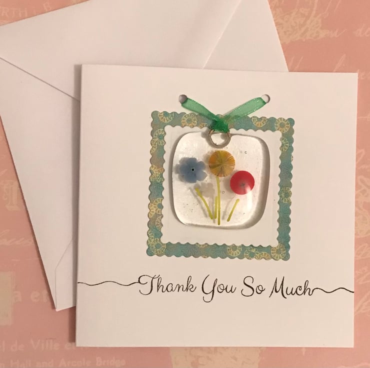 A pretty Thank You card with fused glass flowers decoration which is easily removed from the card to keep forever. Card measures approximately 10cm x 10cm and glass decoration is approximately 3cm x 3cm with flower millefiori fused in the middle and hanging on a green organza ribbon. The card is blank inside for your own message.