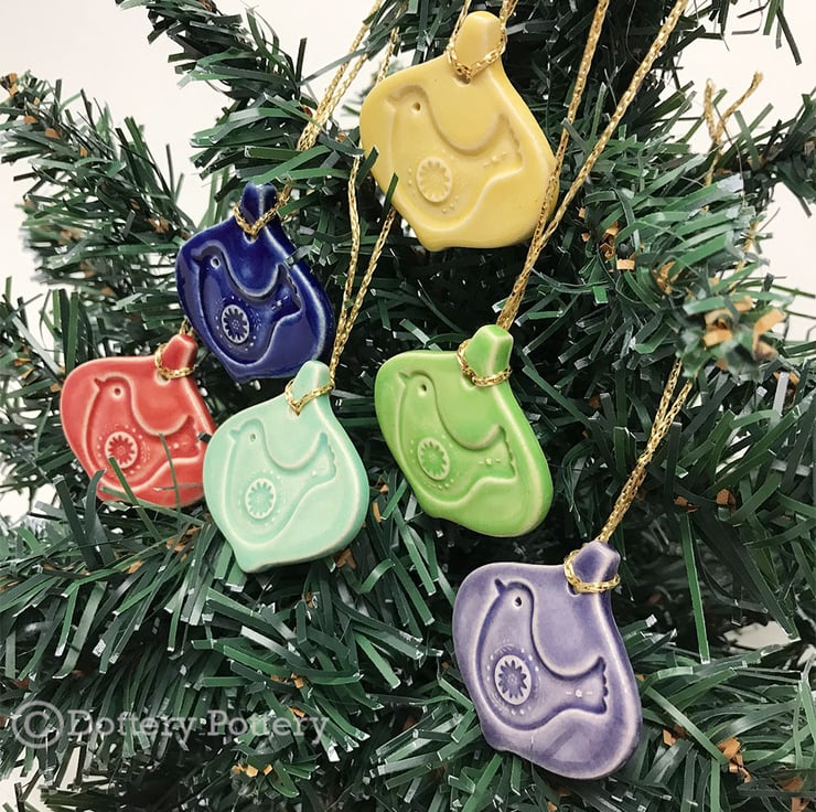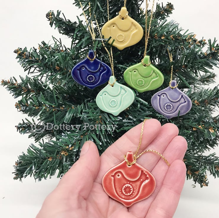 Set of Six. These teeny little bauble decorations could be hung on a tree or you could use them as gift tags. They have been made from white earthenware clay and glazed in bright, cheerful glazes. They measure 4cm x 4cm x 3mm deep. Glazed on the front only - they are left plain on the back. (You can write on the back with a fine permanent marker if you wish to use them as gift tags on presents)