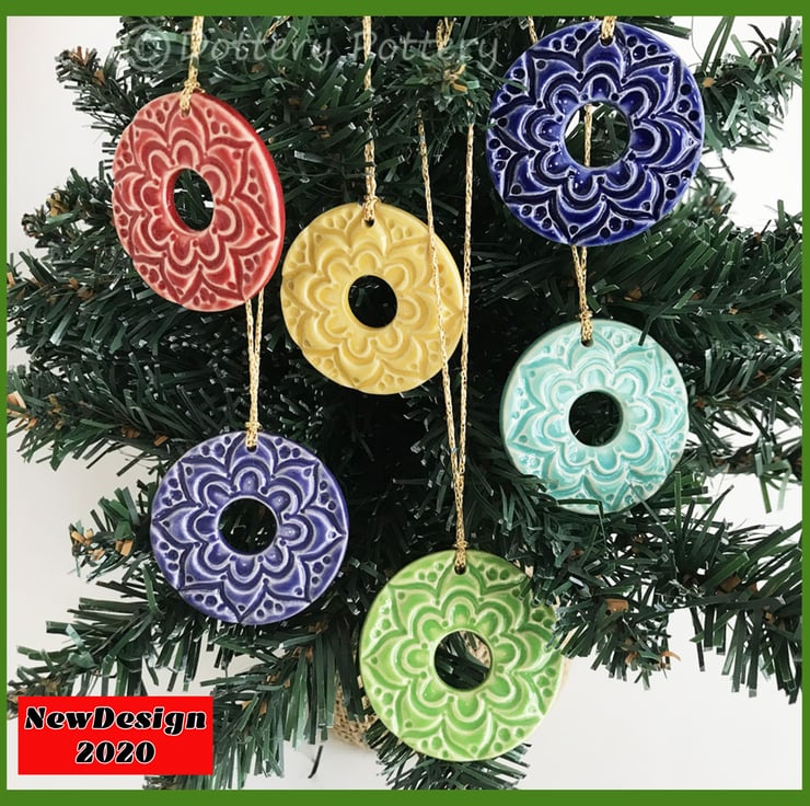 Set of Six. These little lightweight disc decorations have been made from white earthenware clay, imprinted with bold pattern and glazed in bright, cheerful glazes. They measure 4.5cm diameter x 3mm deep. Glazed on the front only