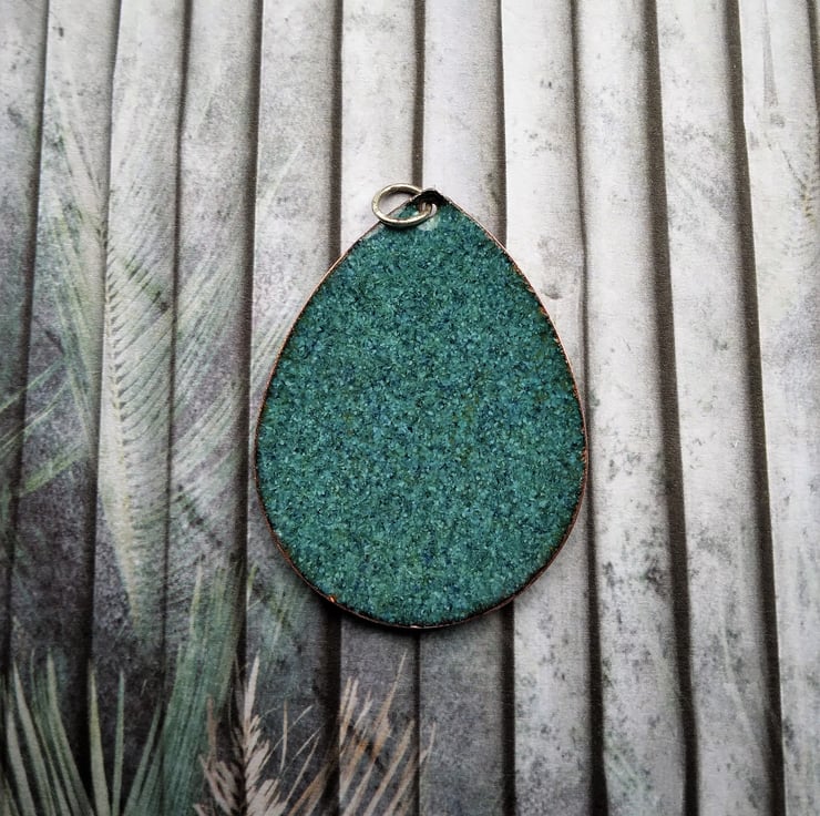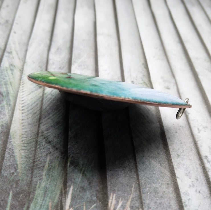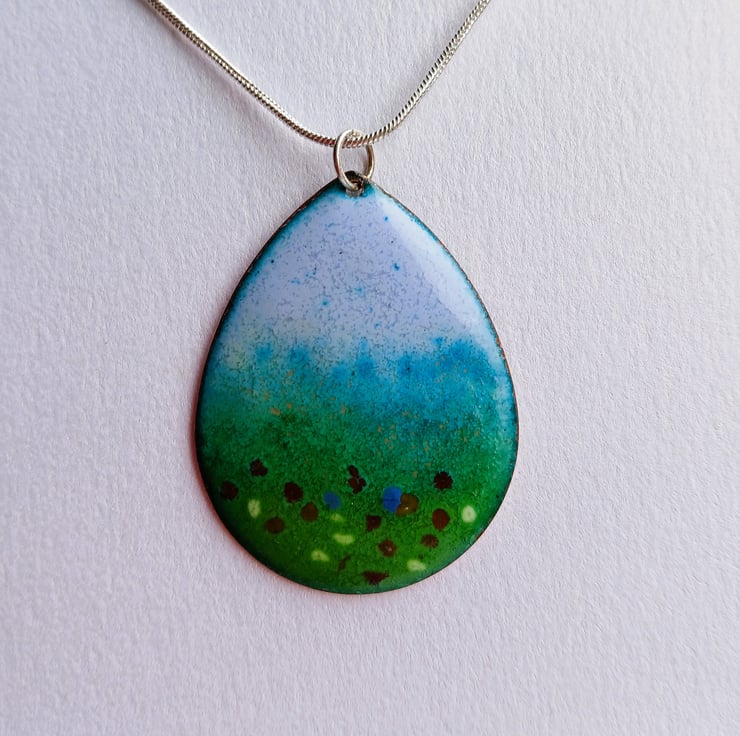 Large teardrop enamelled copper pendant with a summer meadow under blue skies. The pendant has been kiln-fired and measures approximately 42mm long and 32mm in diameter at its widest point. To complete the piece aesthetically and for a smooth finish against the skin, the back has been given two coats of greeny-blue tweed-effect enamel. It comes complete with a soldered sterling silver jump ring and is supplied with an 18" silver plated snake chain and a little organza pouch.
