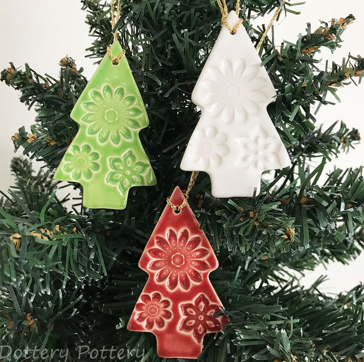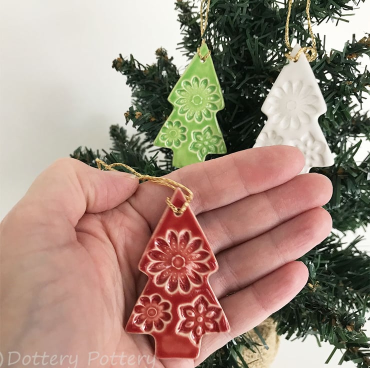 Set of Three. These little lightweight tree shaped decorations have been made from white earthenware clay, imprinted with bold pattern and glazed in traditional red, white and green glazes. They measure 6.5 cm x 4cm x 3mm deep. Glazed on the front only