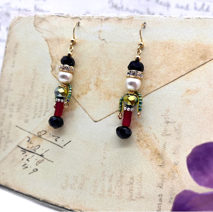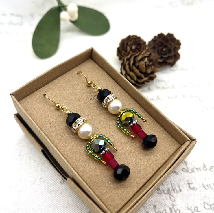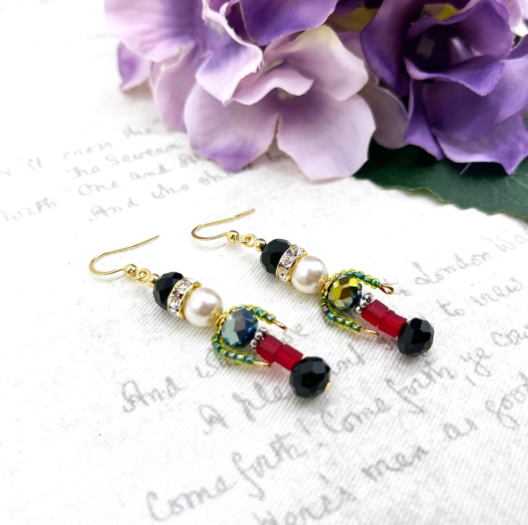 This is a festive treat! A pair of Nutcracker soldier earrings, created from high quality crystal rondelles, glass pearls, cube beads and seed beads,a perfect way to sparkle your way through the festive season!