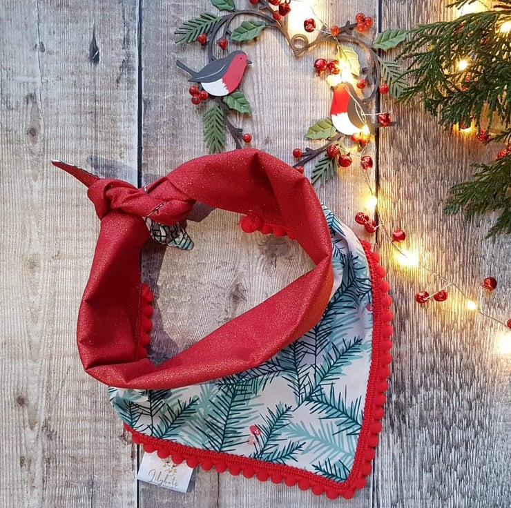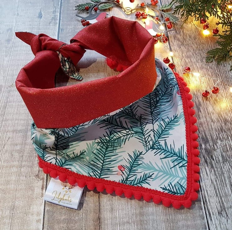 Lilybets tie around dog bandana made using a beautiful high quality 100% organic cotton fabric featuring a modern print design of winter botanic leaves and berries with a red and gold sparkle print cotton fabric to the reverse and a red pom pom trim.