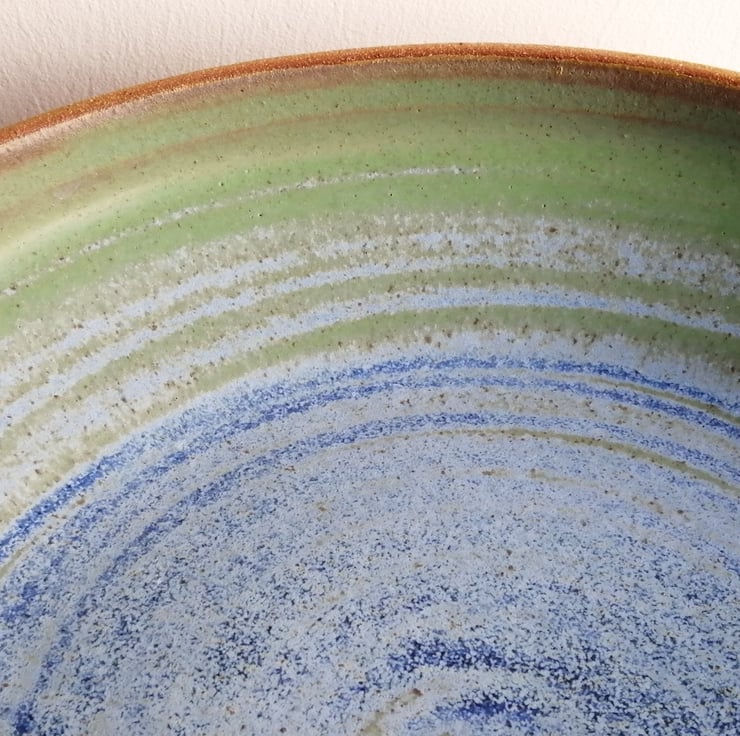 The bowl is first thrown then left until it is leather hard, then turned and I add my makers mark. Once dry it is bisque fired then glazed and fired a second time at 1220 oC. All glazes are lead free.