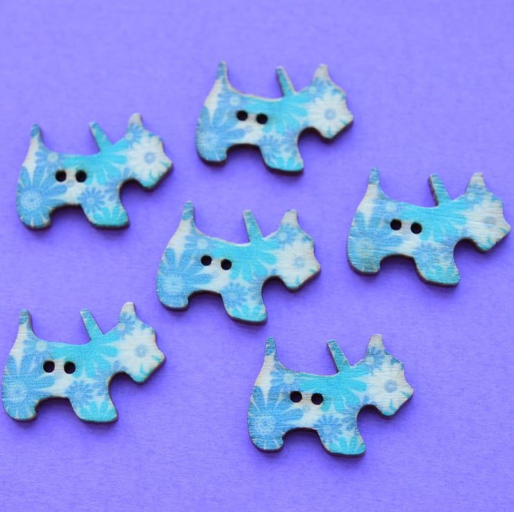 Wooden Scottie Dog Buttons Blue & Cream Flowers 6pk 28x20mm Scotty (DG22)