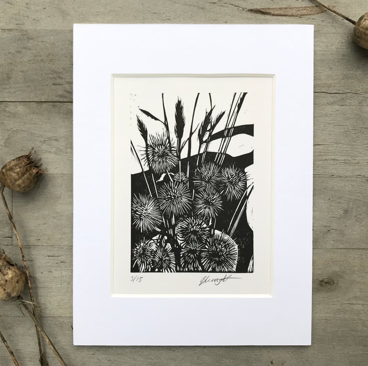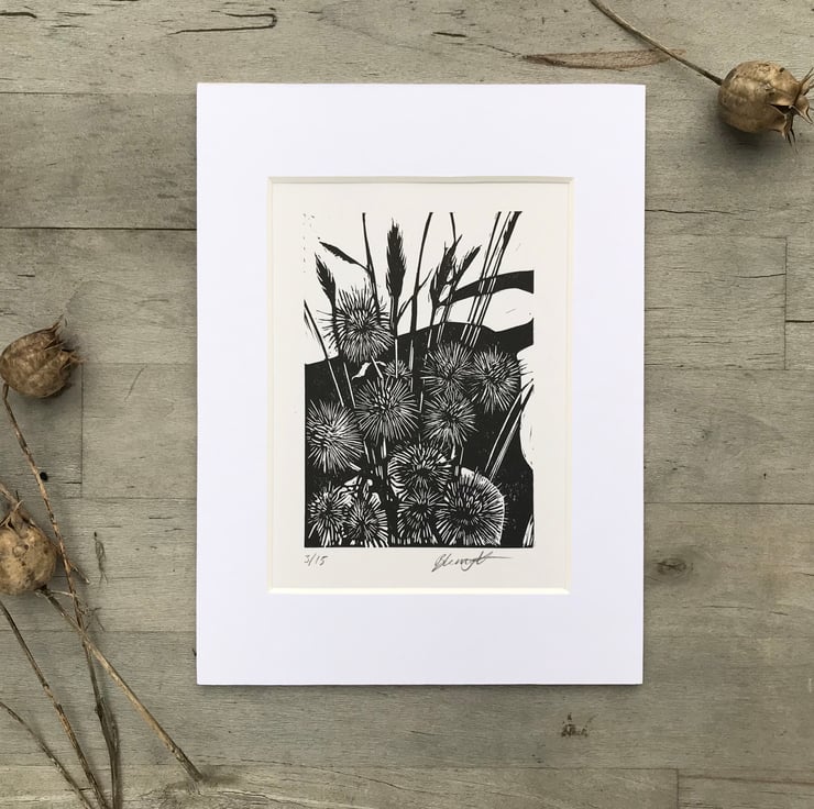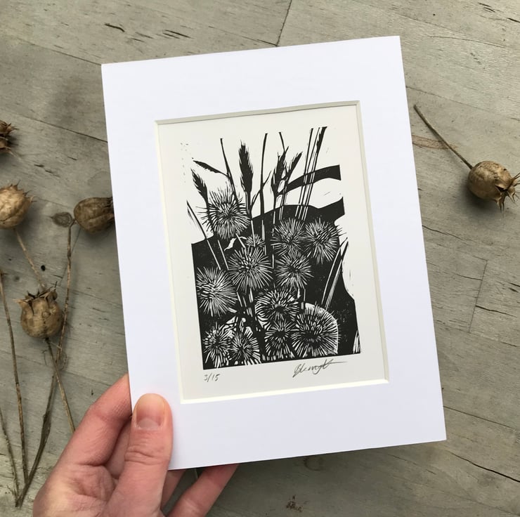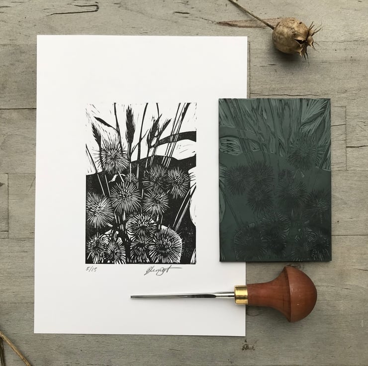 "My lino prints are often inspired by the wildlife around my home in Suffolk, I hand draw my design and then transfer it to the lino and carve out the image, ink is then applied and I print them by hand onto the paper."