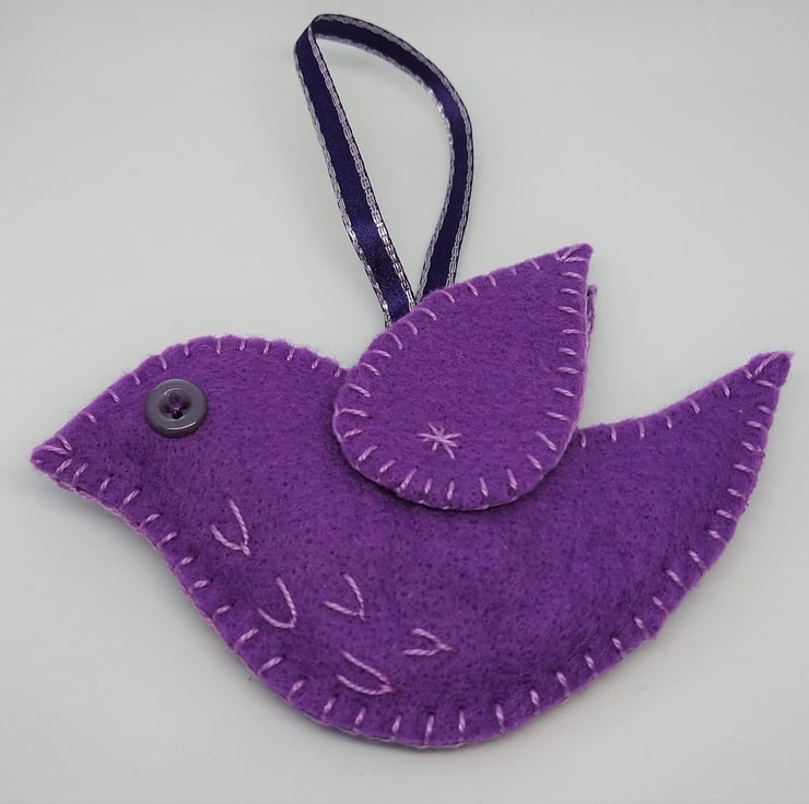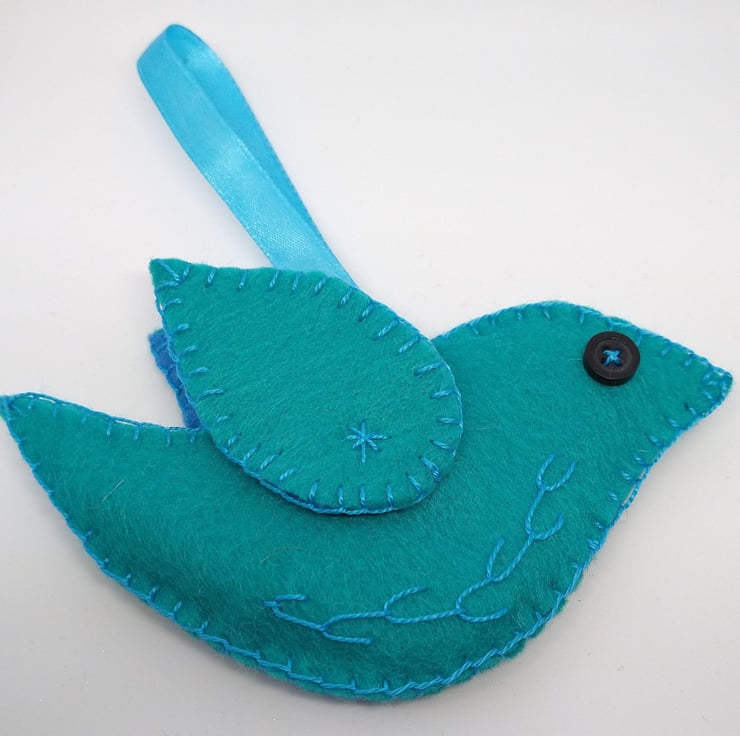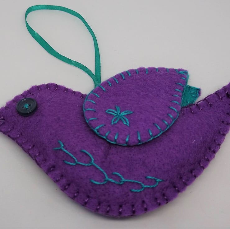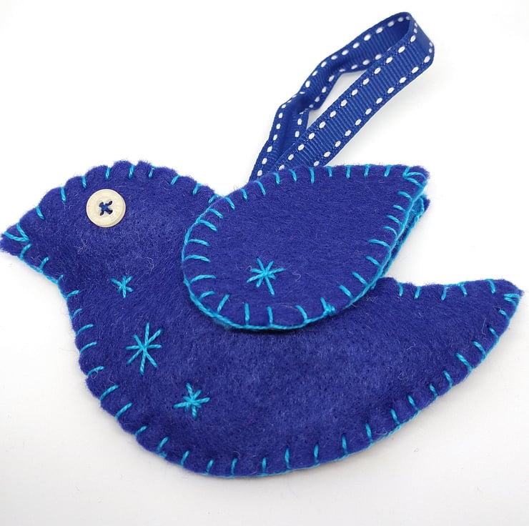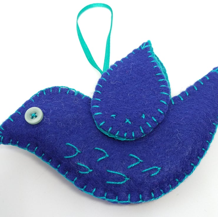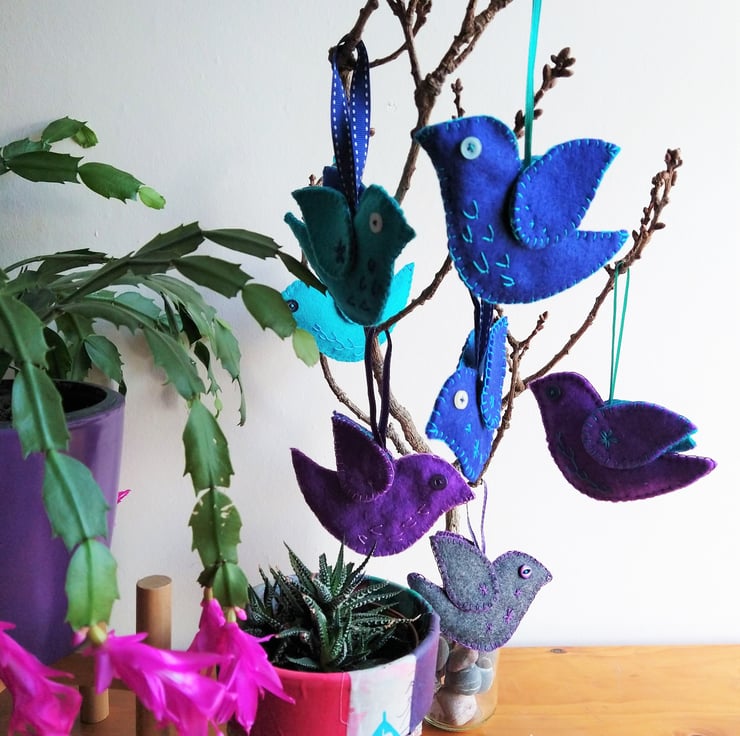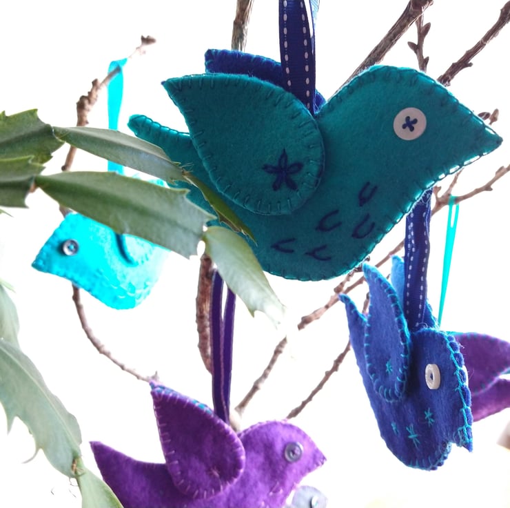 These beautiful birds are all hand stitched from polyester felt (made from recycled plastic bottles) and embellished with hand embroidery, cute button eyes and a little hanging ribbon. They are decorated on both sides so can 'fly' in either direction. The birds all have a contrasting colour wing lining. They'd look great on a Christmas tree but they're too beautiful to only have out once a year, you could have them up all the time!